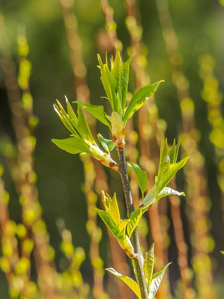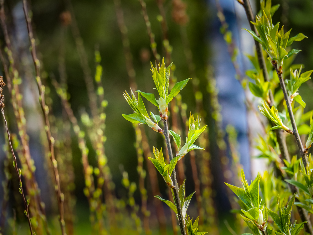 Some plants are just slowly starting to show small buds of leaves, signaling the awakening of nature after the long, cold early spring. So I took a close-up of delicate branches with budding leaves, illustrating the beauty of spring’s emergence against the backdrop of the slowly warming air. These two images are just slightly different, mainly by cropping.