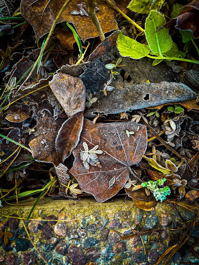 I am running out of ideas at the moment – or should say I am taking the easy way out. Nature and frost are my partners today after a cold night. Frost maybe playing the bigger part, but if you look closely you can see green