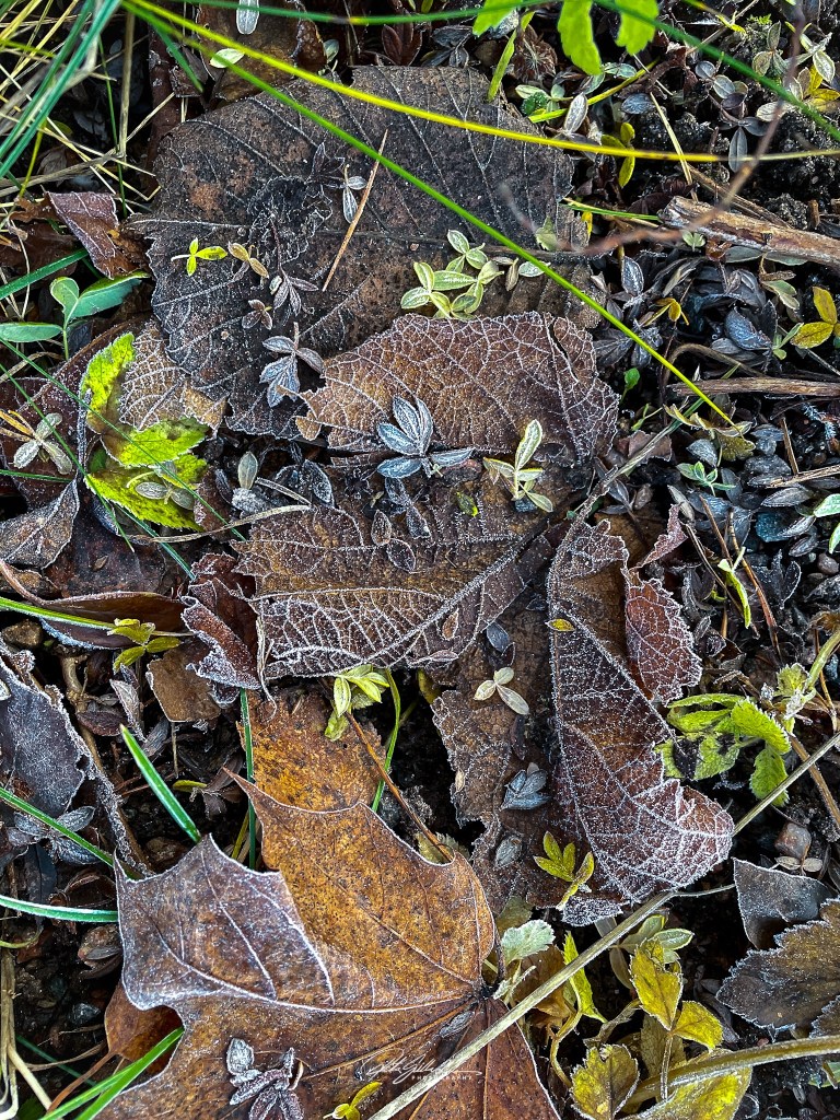 Well, I am happy to present a touch of green to you. This morning as I was on my way to the car, the frost had made beautiful white lines to the brown leaves. To my joy I also spotted green. Mission for the day accomplished
