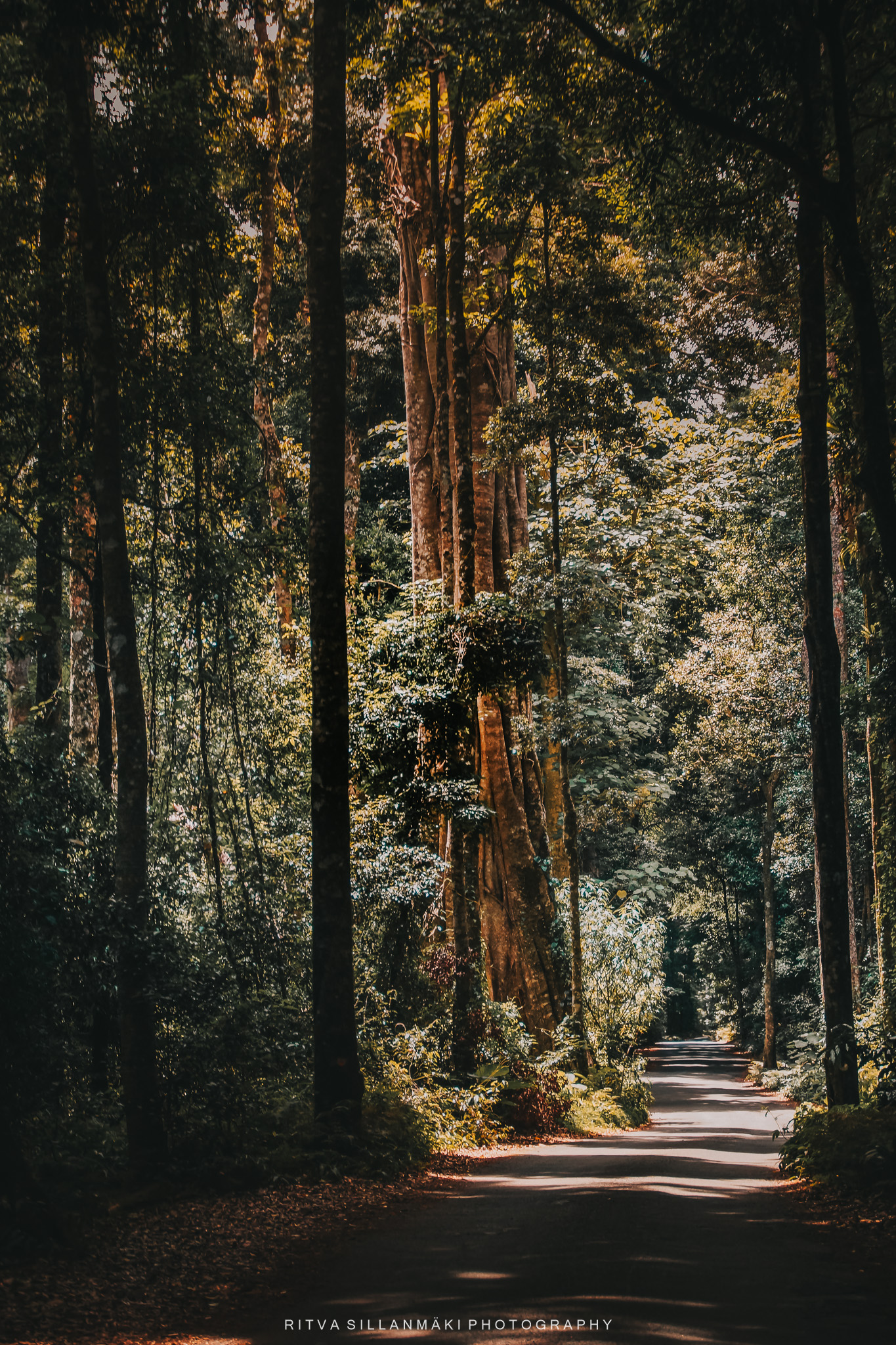 A serene and secluded forest path, enveloped by tall, lush green trees in Queensland. Sunlight filters through the canopy, casting dappled shadows on the smooth, inviting trail. It was a delight to venture along this winding path.