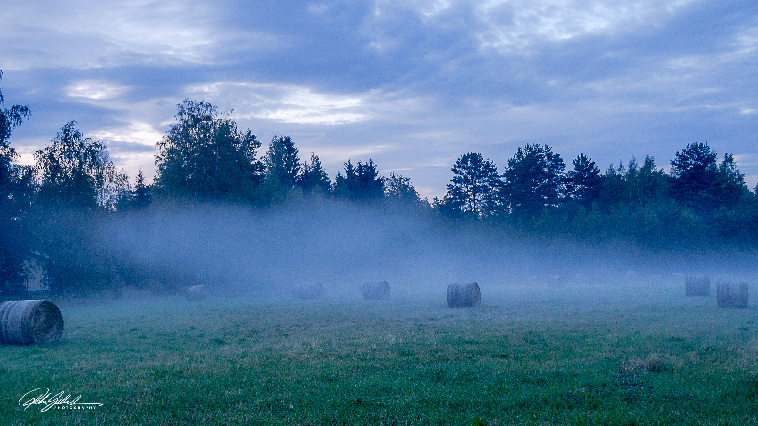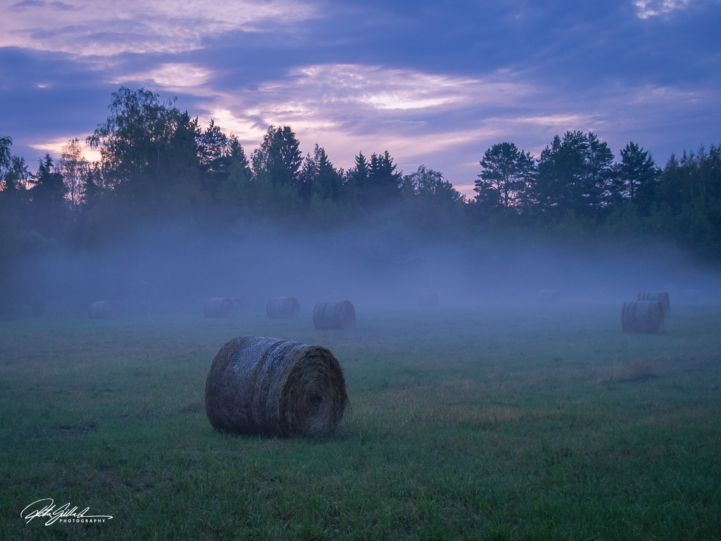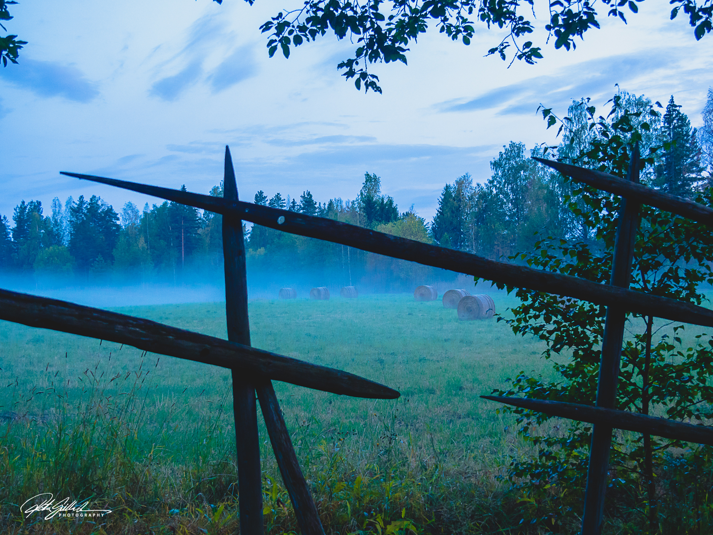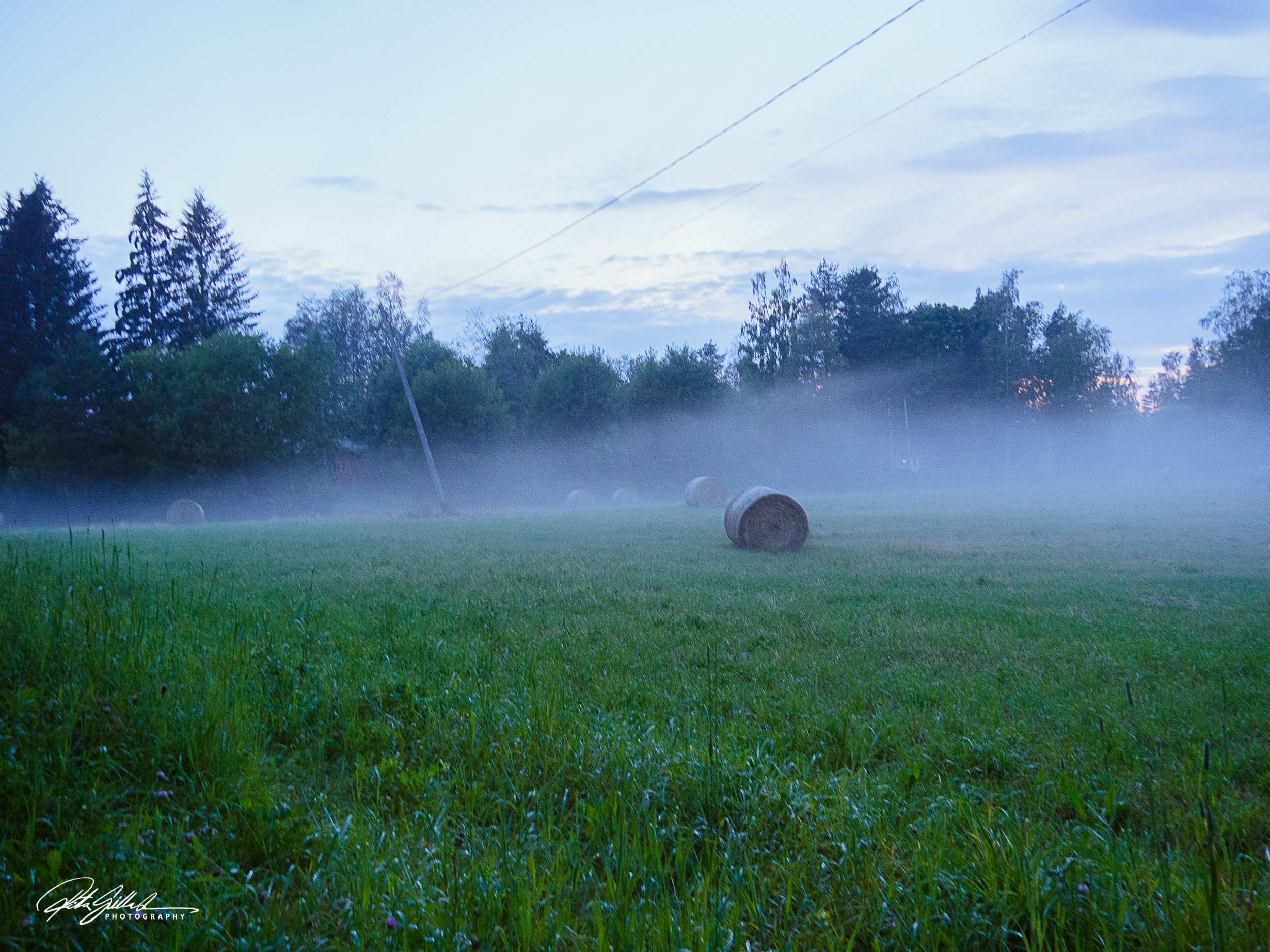 Beautiful sunset at near my summer house in Lahti, the green fields and orange sky make a beautiful contrast. Mist always adds an extra plus to the scenary