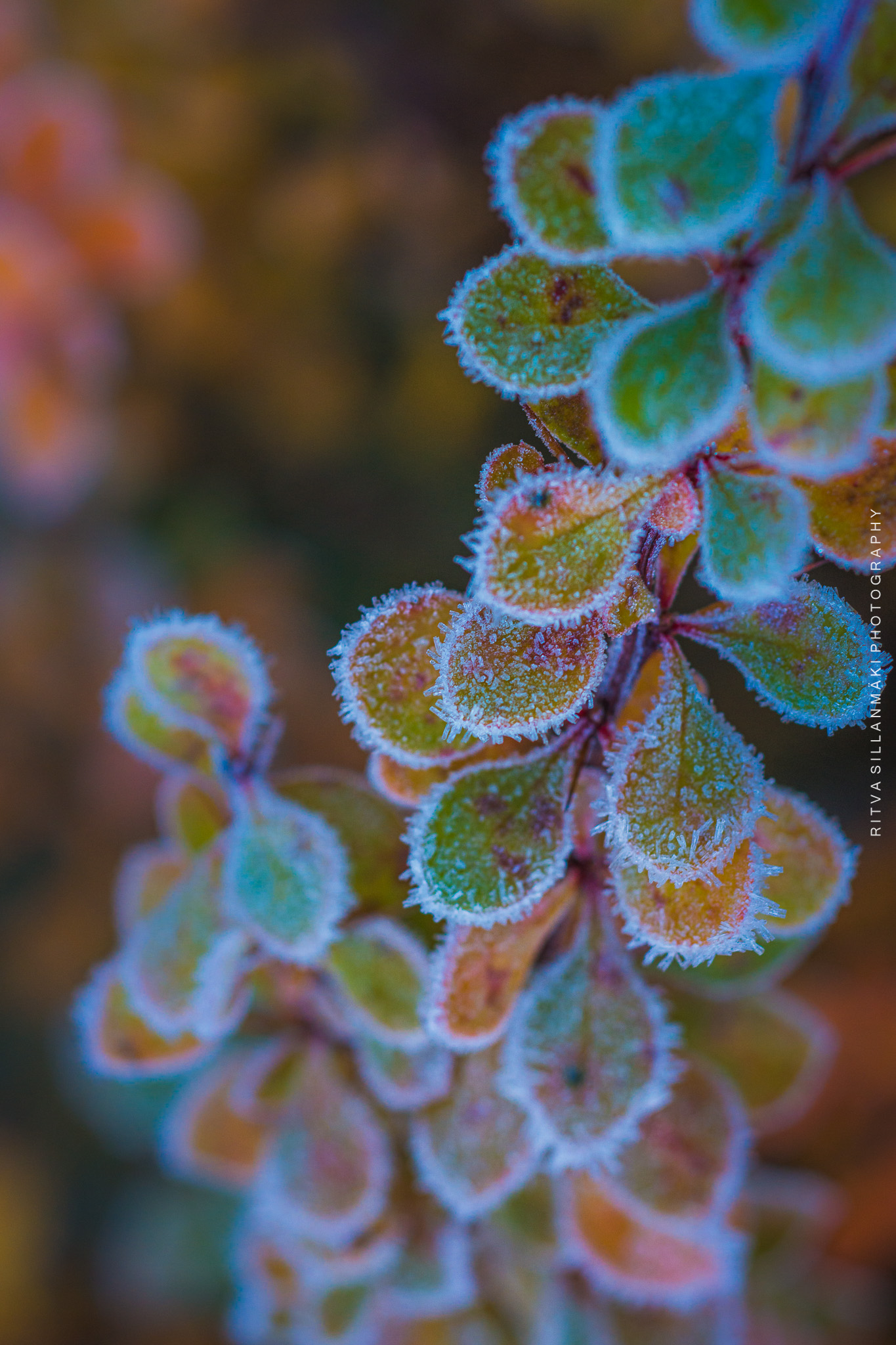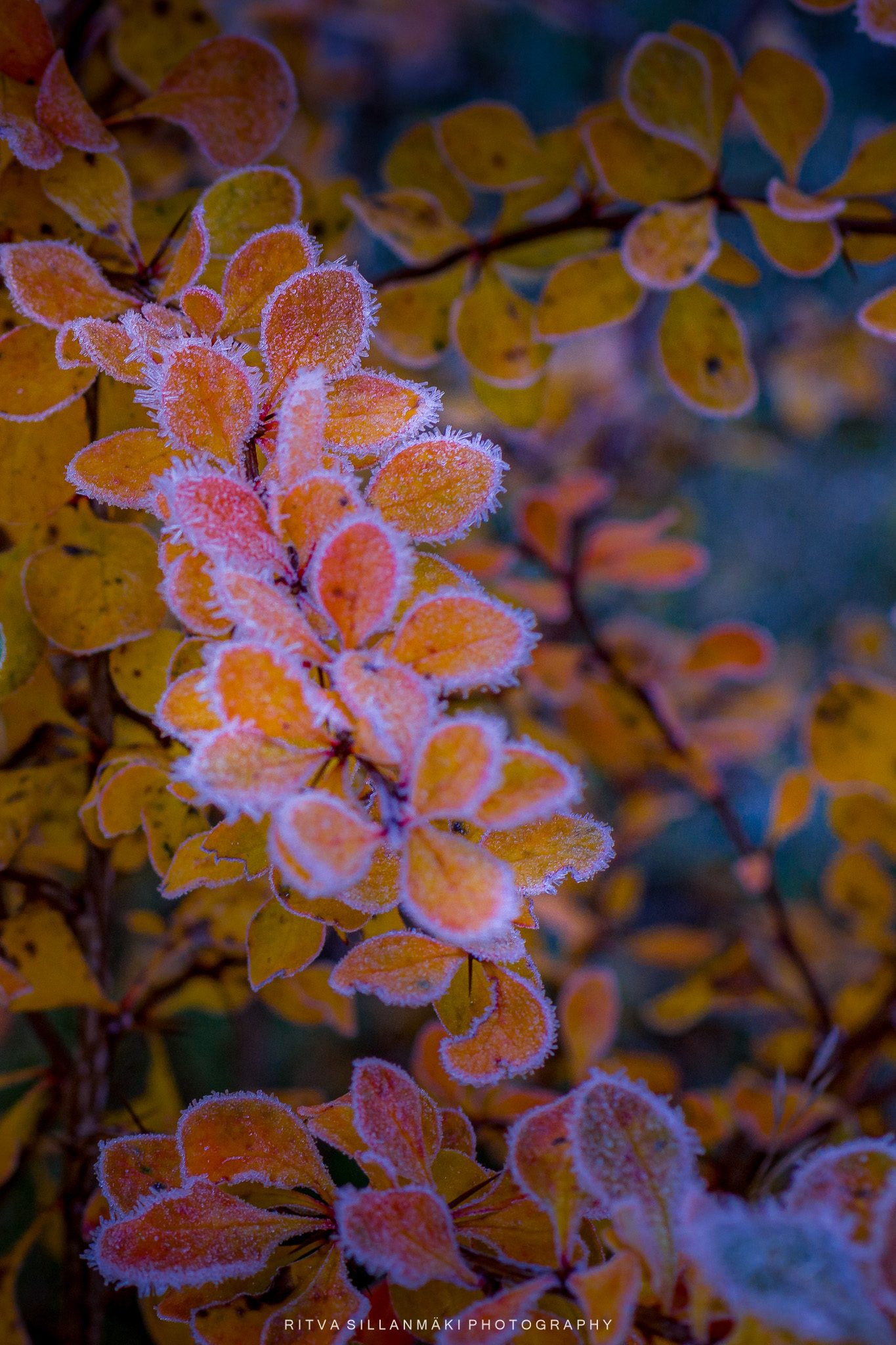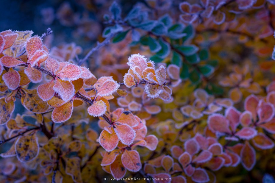 November frost, the first bite of winter on these colorful leaves of barberry, I think that is the name of this plant, is or not, it sure looks pretty. The crisp air carries with it a stillness that amplifies the vivid reds and yellows of the leaves. As I stood there looking for a right angle to take a photograph, I couldn’t help but marvel at how such a small shrub can capture the essence of the changing seasons, hinting at the chill to come while still clinging to its vibrancy. Each leaf seems to shimmer with the promise of winter, creating a breathtaking contrast that leaves a lasting impression.