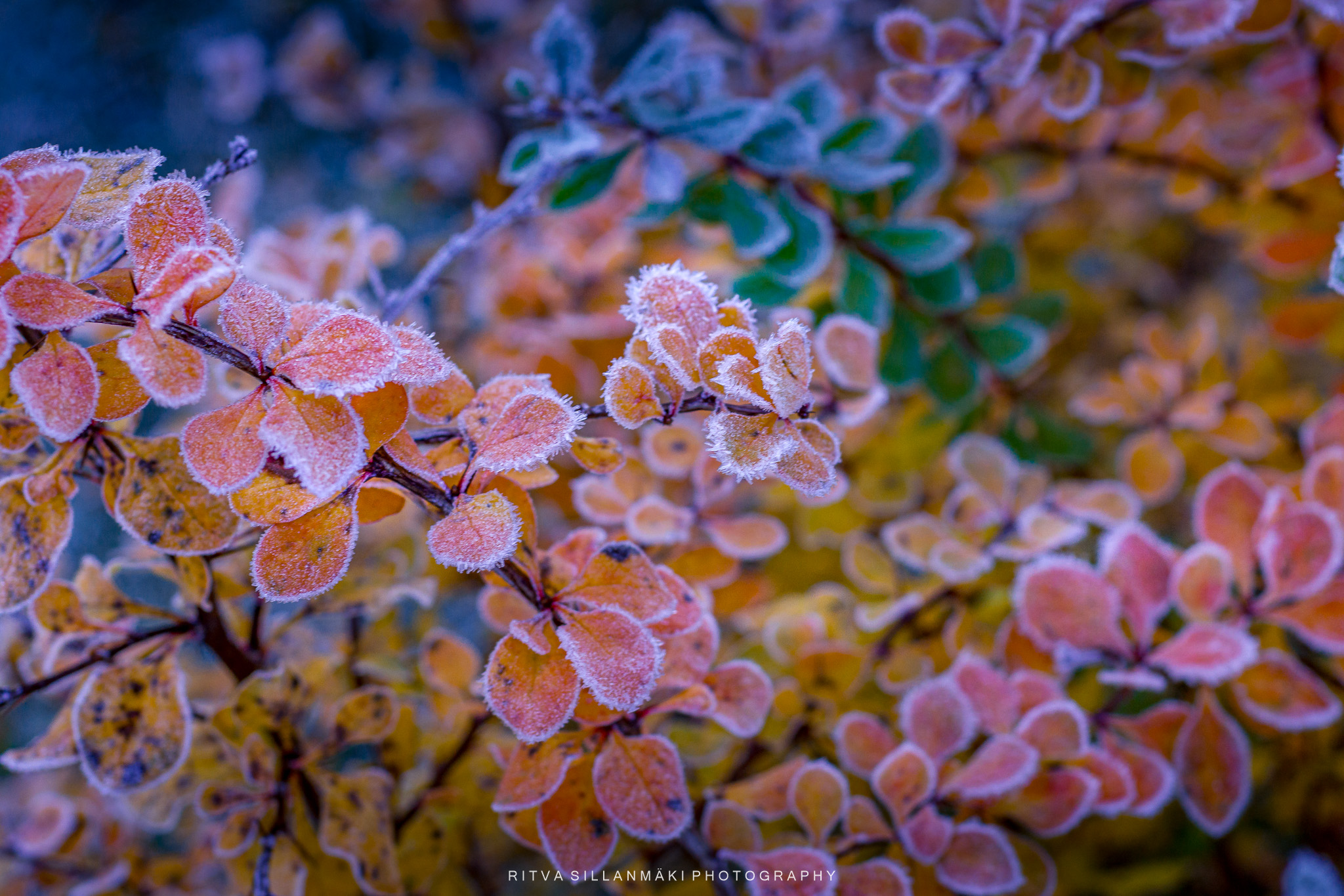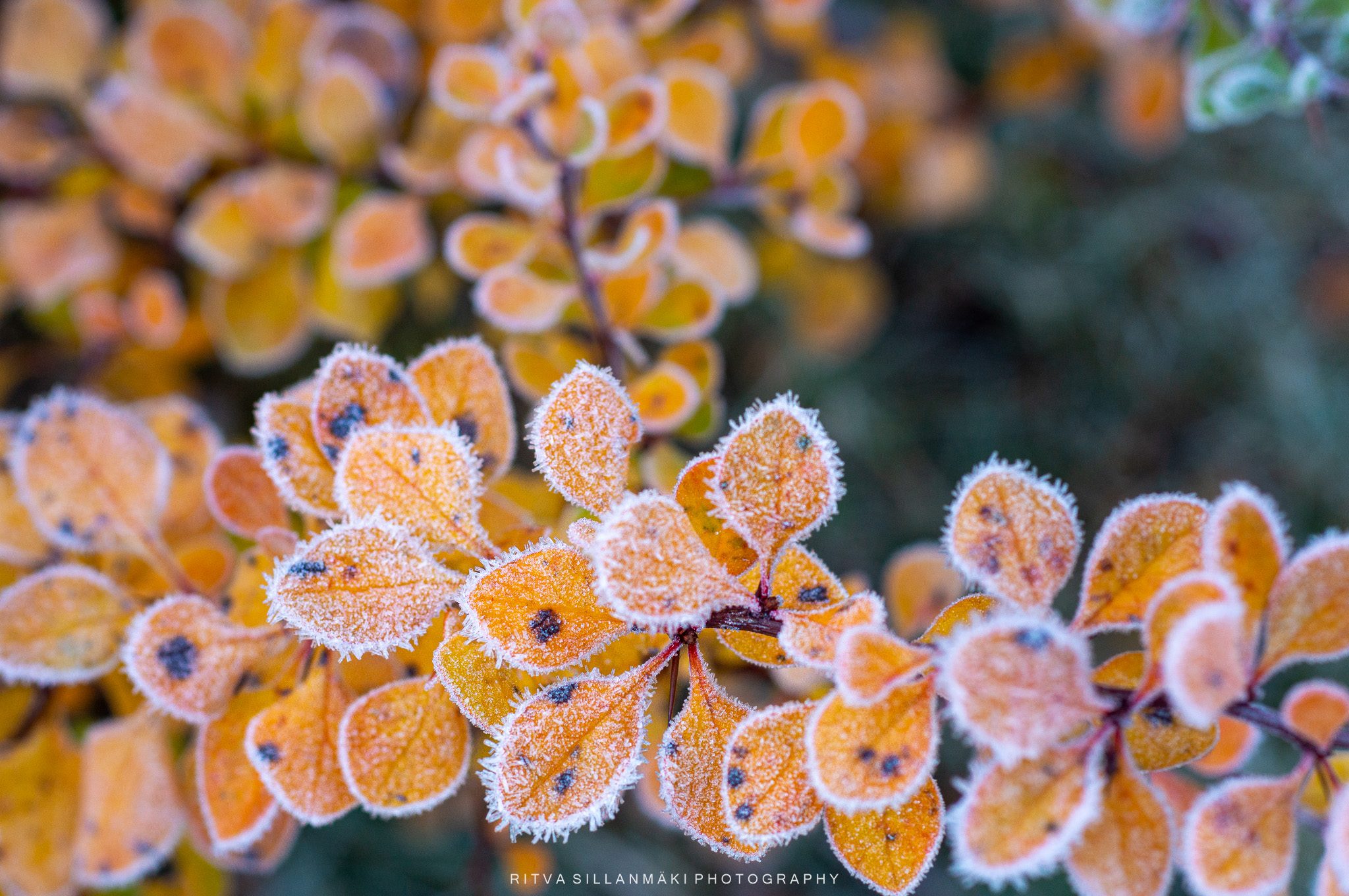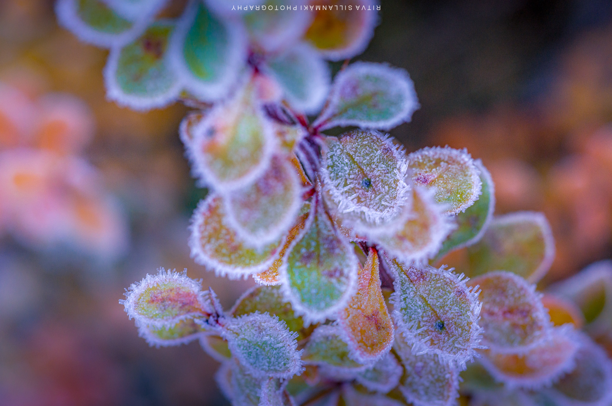 November frost, the first bite of winter on these colorful leaves of barberry, I think that is the name of this plant, is or not, it sure looks pretty. The crisp air carries with it a stillness that amplifies the vivid reds and yellows of the leaves. As I stood there looking for a right angle to take a photograph, I couldn’t help but marvel at how such a small shrub can capture the essence of the changing seasons, hinting at the chill to come while still clinging to its vibrancy. Each leaf seems to shimmer with the promise of winter, creating a breathtaking contrast that leaves a lasting impression.
