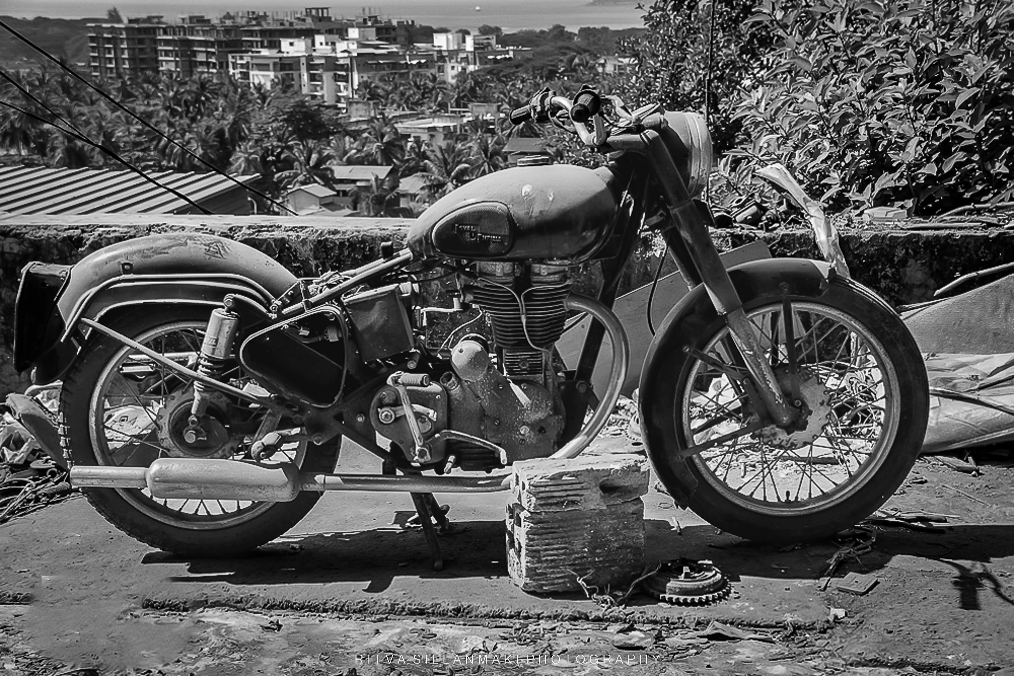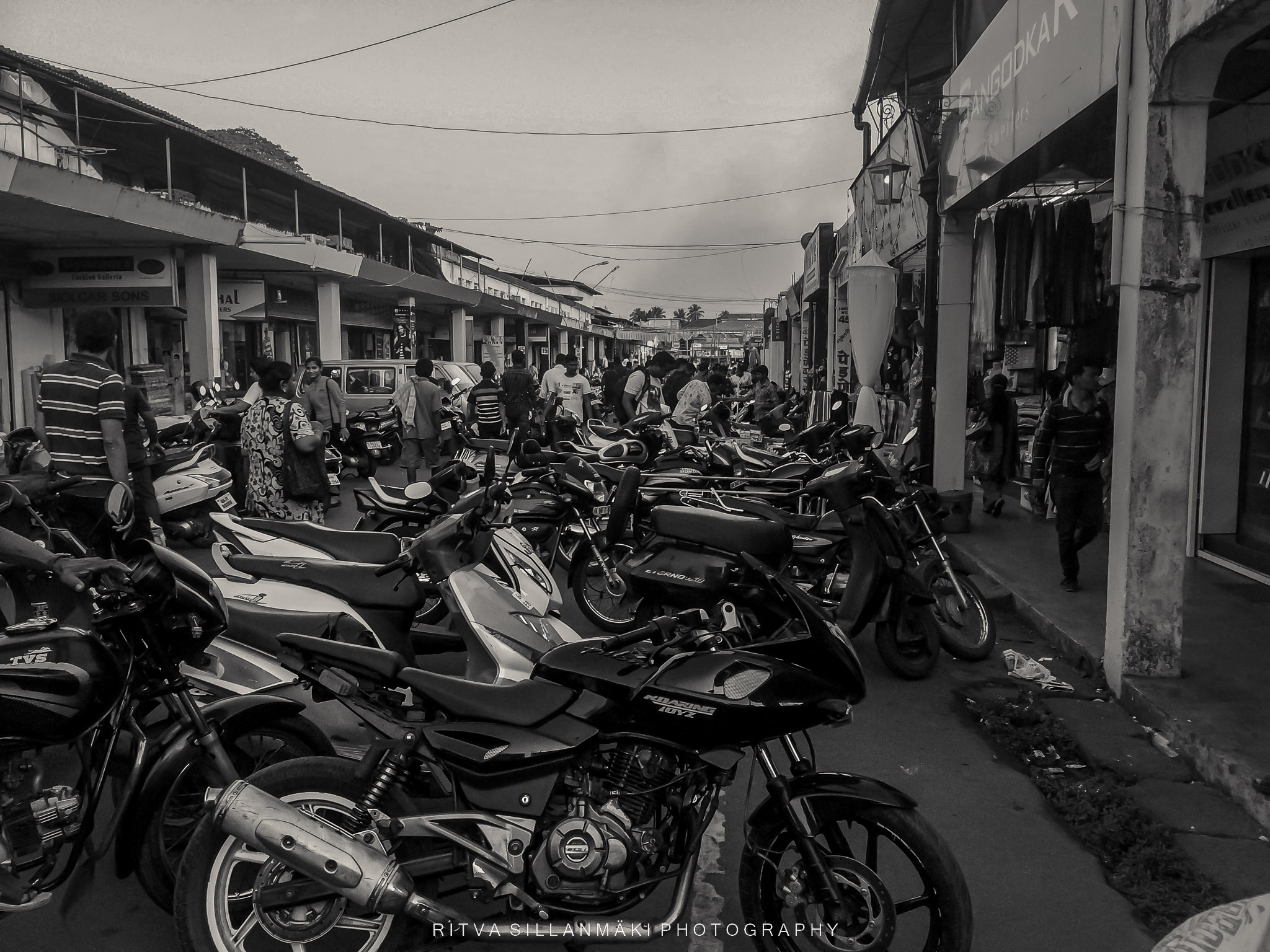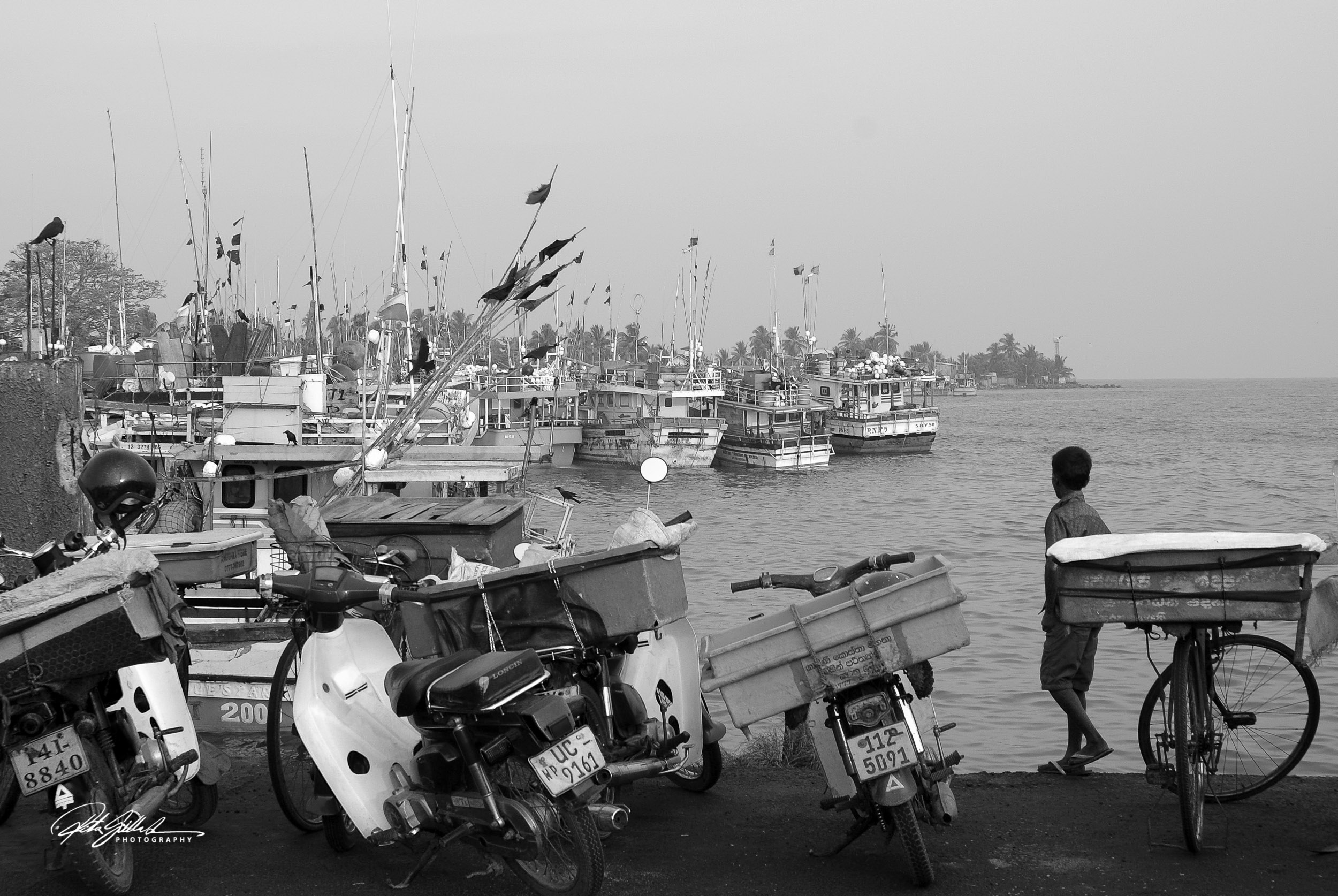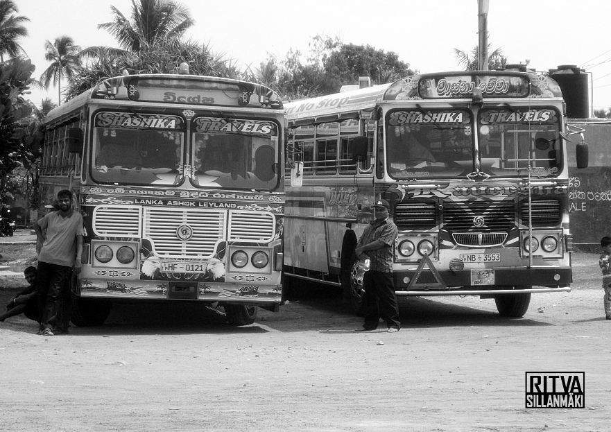 Colorful public buses, but in B&W , the local transportation in Sri Lanka.