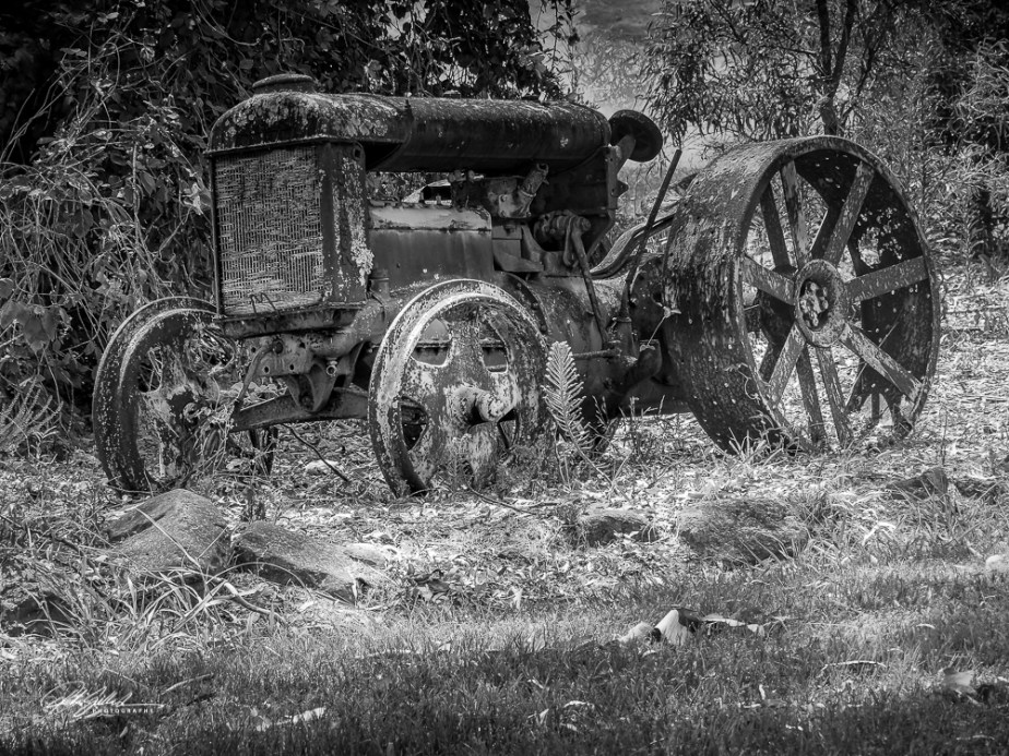 An old, rusted tractor abandoned in a field,that shows the passage of time and the remnants of agricultural transport.