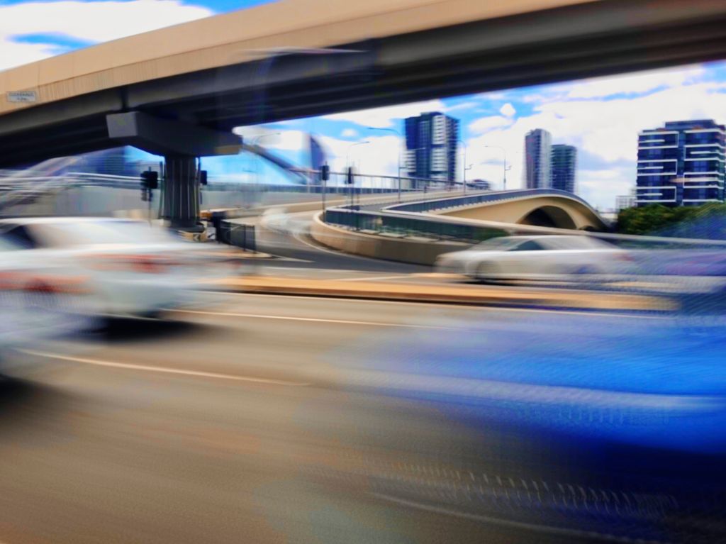 Children play with bubbles on a bustling promenade, capturing a moment of joy and movement.A dynamic view of blurred cars moving swiftly past urban architecture, capturing a sense of motion.
