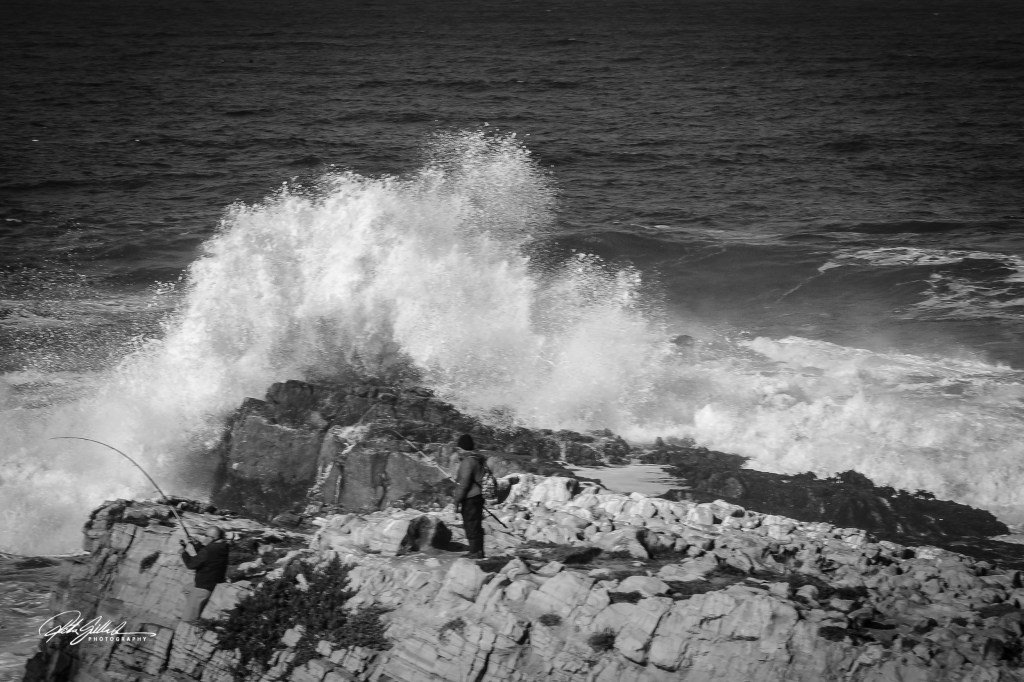 Fishermen casting their lines against crashing waves on the rocky shore.