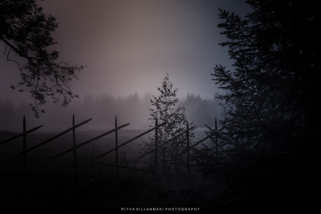 A landscape featuring silhouettes of trees and a rustic fence, shrouded in fog.