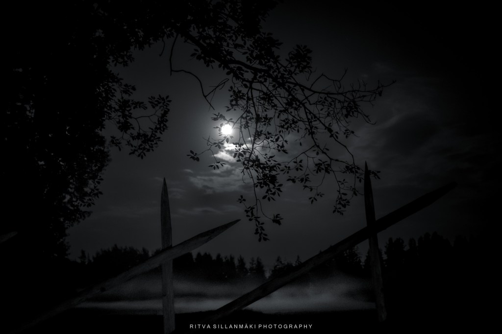 A haunting monochrome night scene with a full moon partially obscured by clouds and silhouetted trees, framed by wooden stakes.