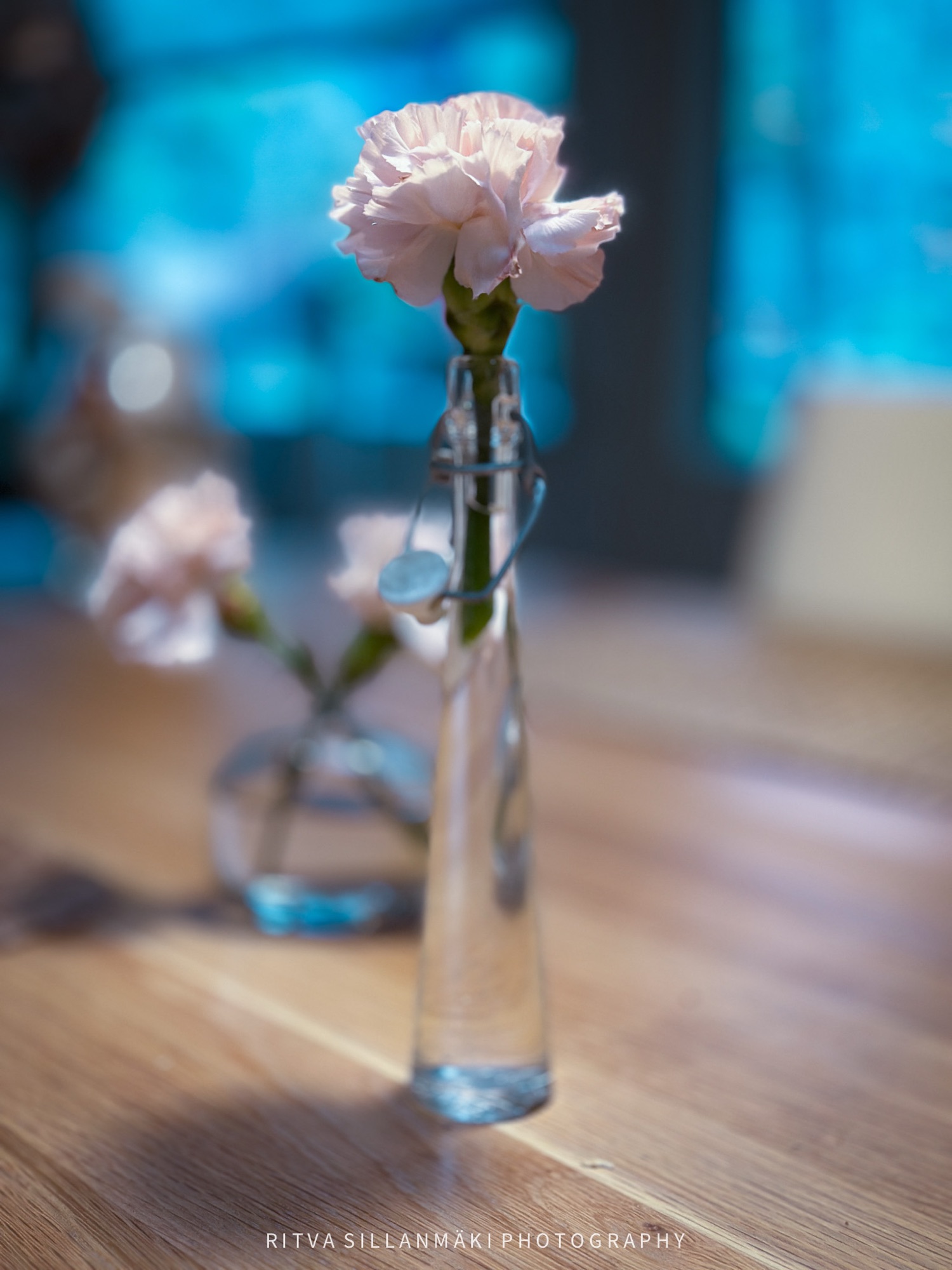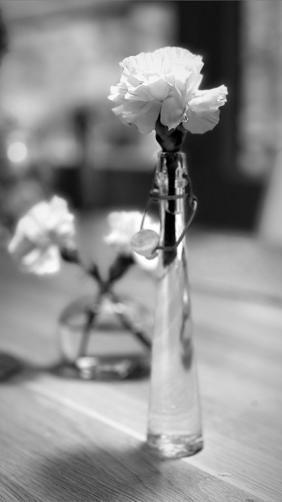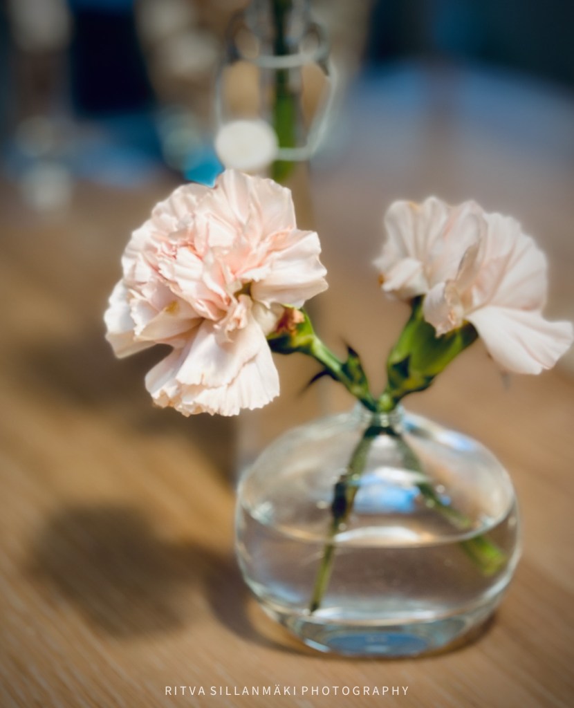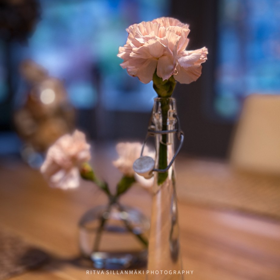 Carnations in a vase, adding a touch of elegance to the table. Square for NovemberShadowsA close-up of a delicate pink carnation in a glass bottle, capturing the essence of everyday beauty and resilience.⬜