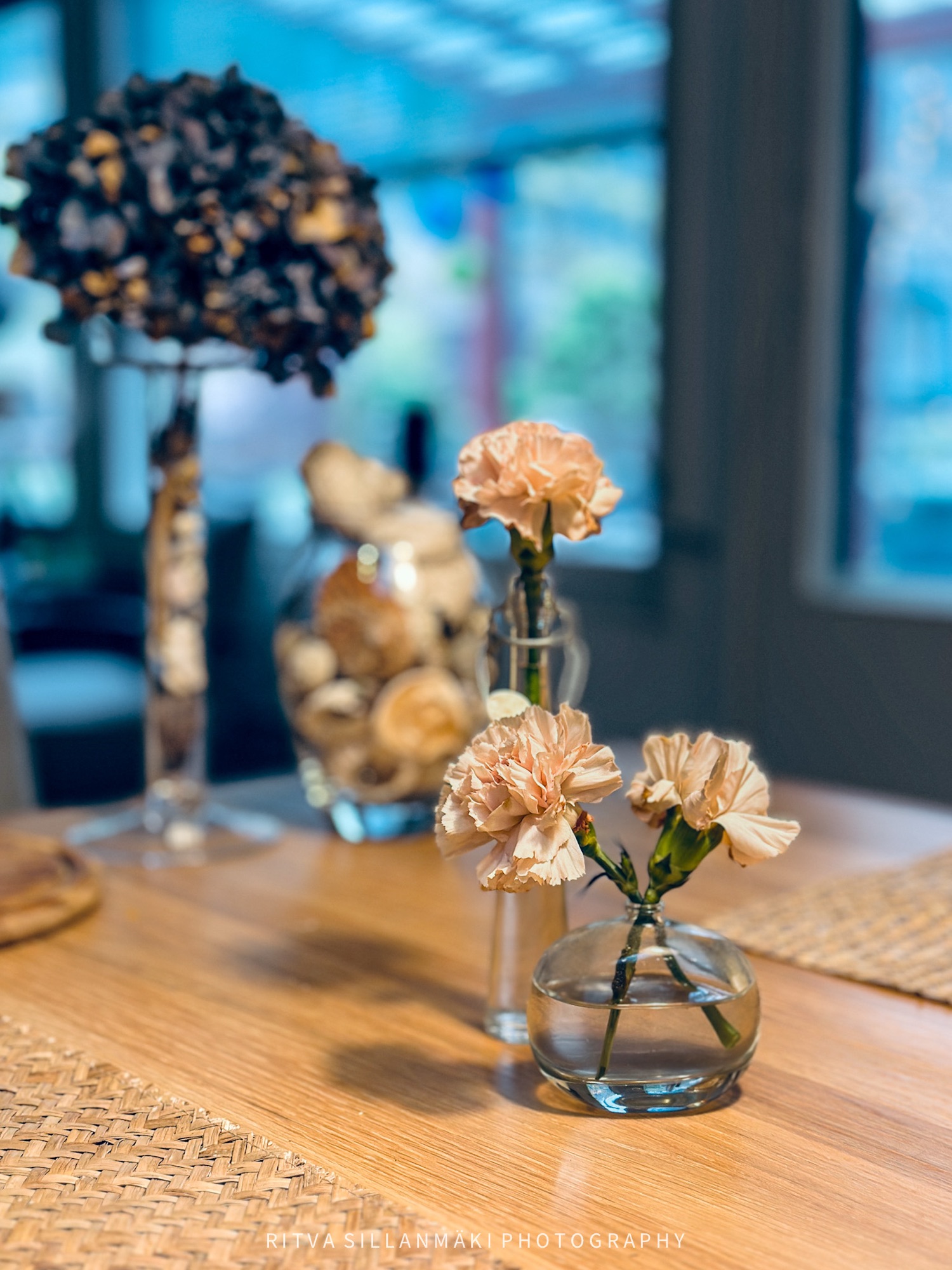 A serene arrangement of pink carnations in delicate glass vases, beauty and resilience. For how to Survive November