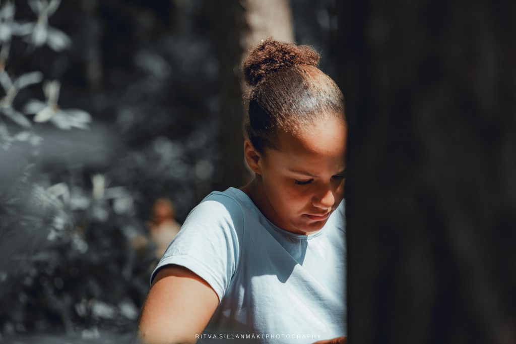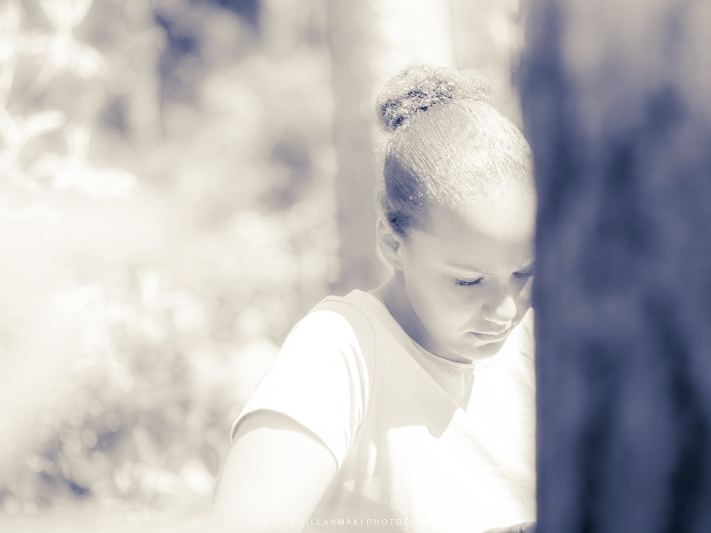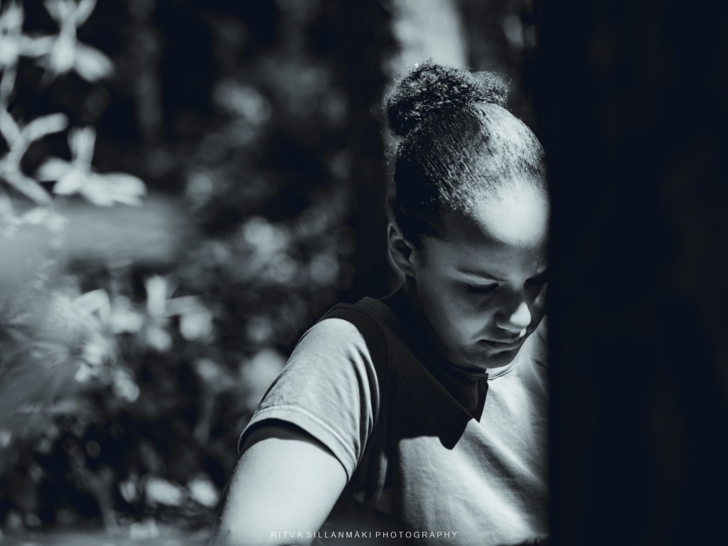 In the absence of a theme for Monochrome Madness, I experimented with one image in three versions, focusing on varying lighting and contrast to bring out different moods and emotions in the monochrome portrayal. The main subject of the monochrome portrait is a young girl who appears immersed in deep contemplation, portrayed in a serene natural setting as she thoughtfully gazes downward, which beautifully highlights her profound connection with the environment around her.