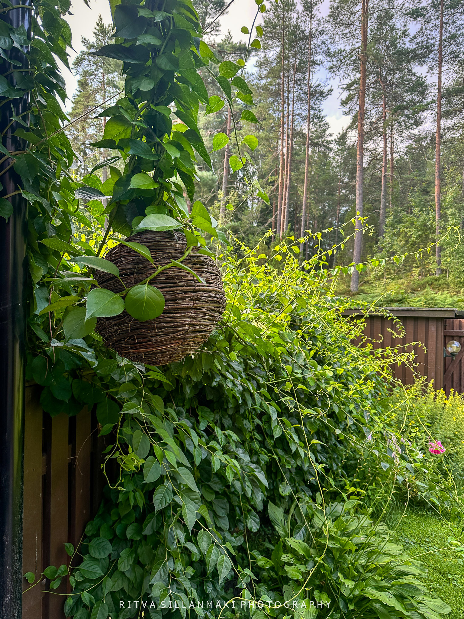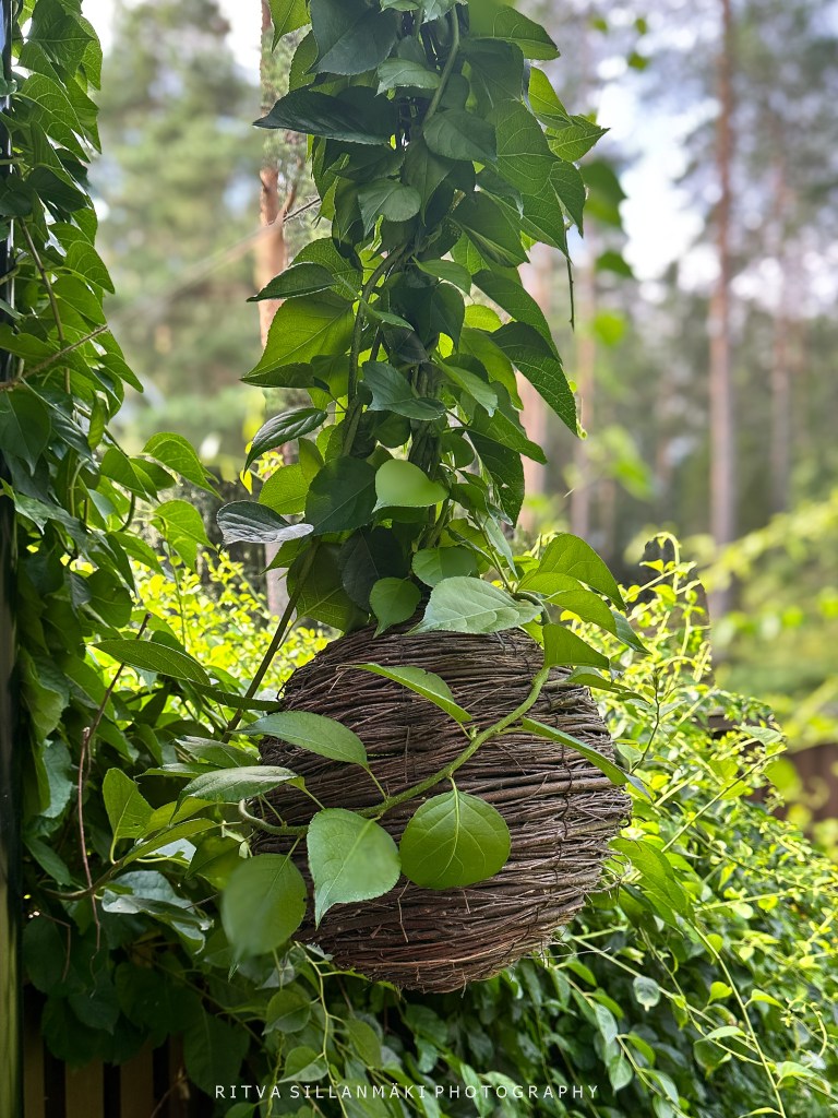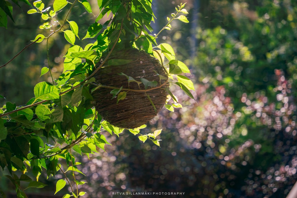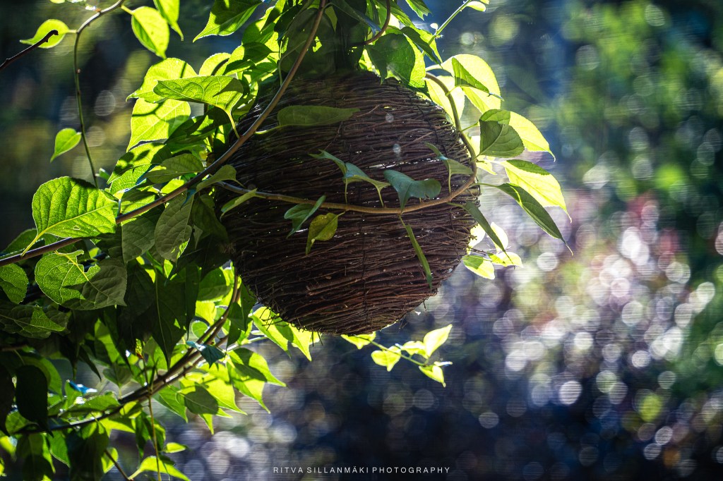 A intricately woven twig ball and surrounded by vibrant green leaves, catching the sunlight with a lovely bokeh in the background.Backlight and bokeh, make this shot.