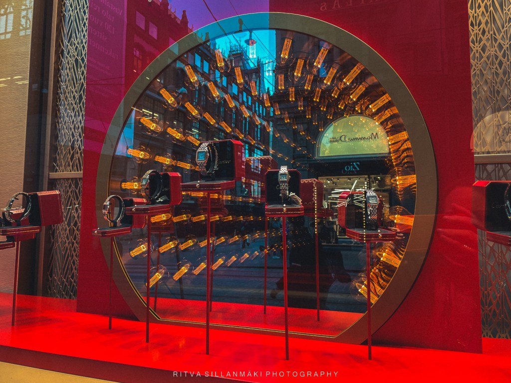 Some season lights were already adding light to the bleakness of this time of year. The boy looking at the display window while his parents were in line to get into the store was a nice pop of colors as was the Cartier window display with the reflecting lights from the street.