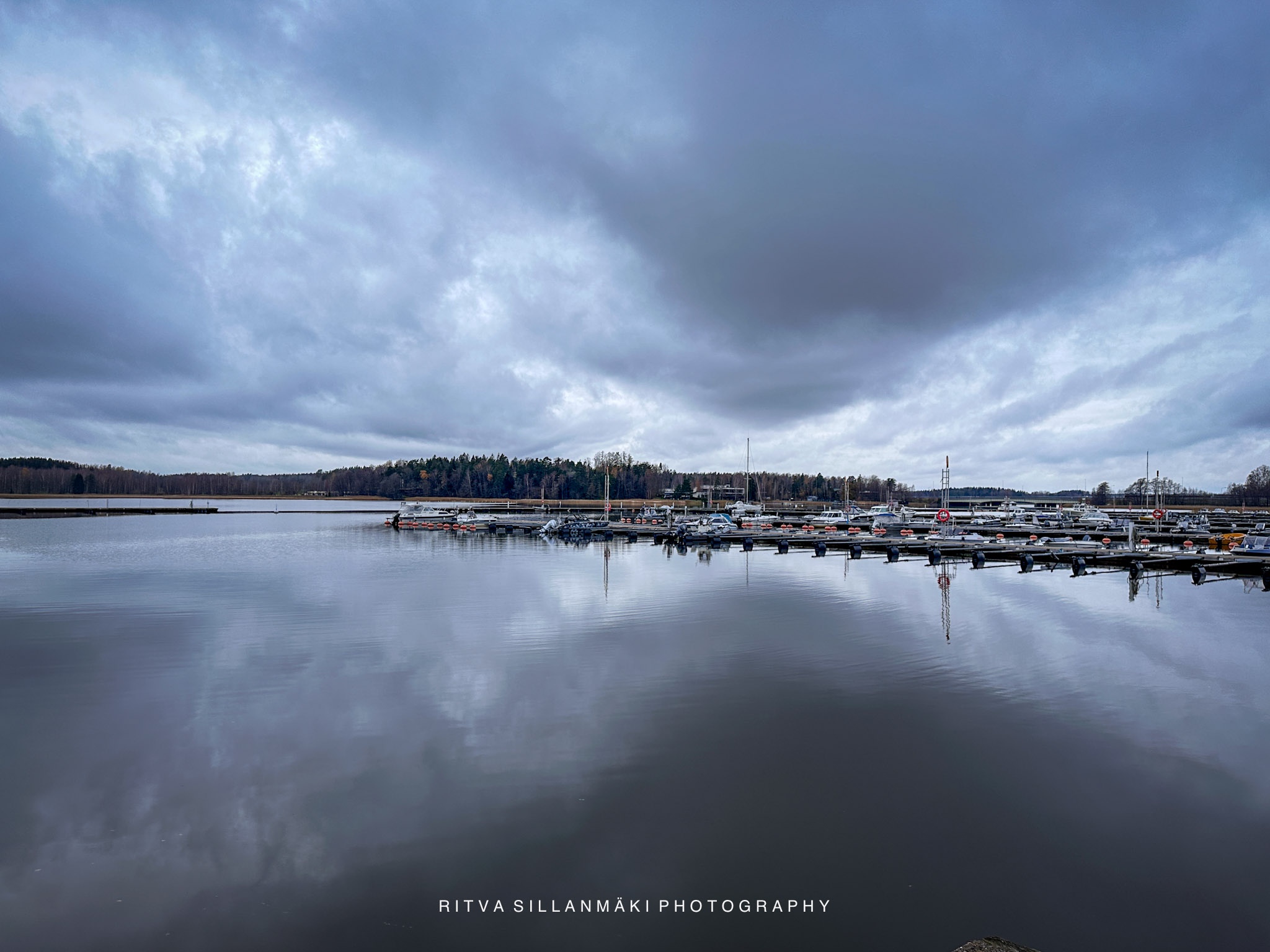 The sky is gray, the water is dull and the air is cold. I see the boats are moored, the sails are furled , the marina is quiet with hardly anyone around. But I don’t mind, I like it here.