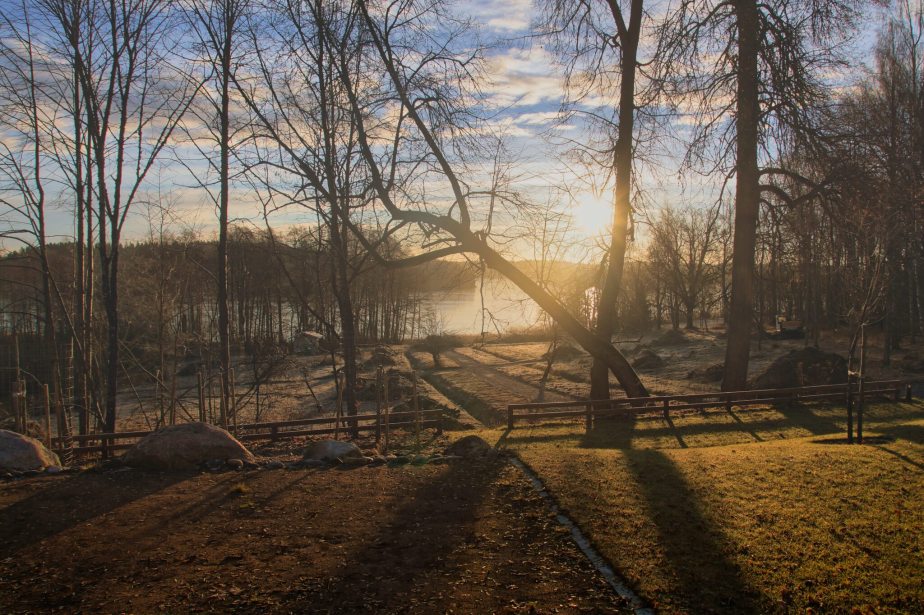 So far so good, and today we have a surprisingly beautiful morning, the sky is blue, trees are bare, except for a few leaves hanging on the branches, slightly moving in the wind. There are still signs of the cold night on the grass and a few red berries glow in the sunlight. The light created shadows across the landscape, illuminating everything with a gentle warmth. That is what I see from my window at this moment, a perfect snapshot of nature awakening to another day.