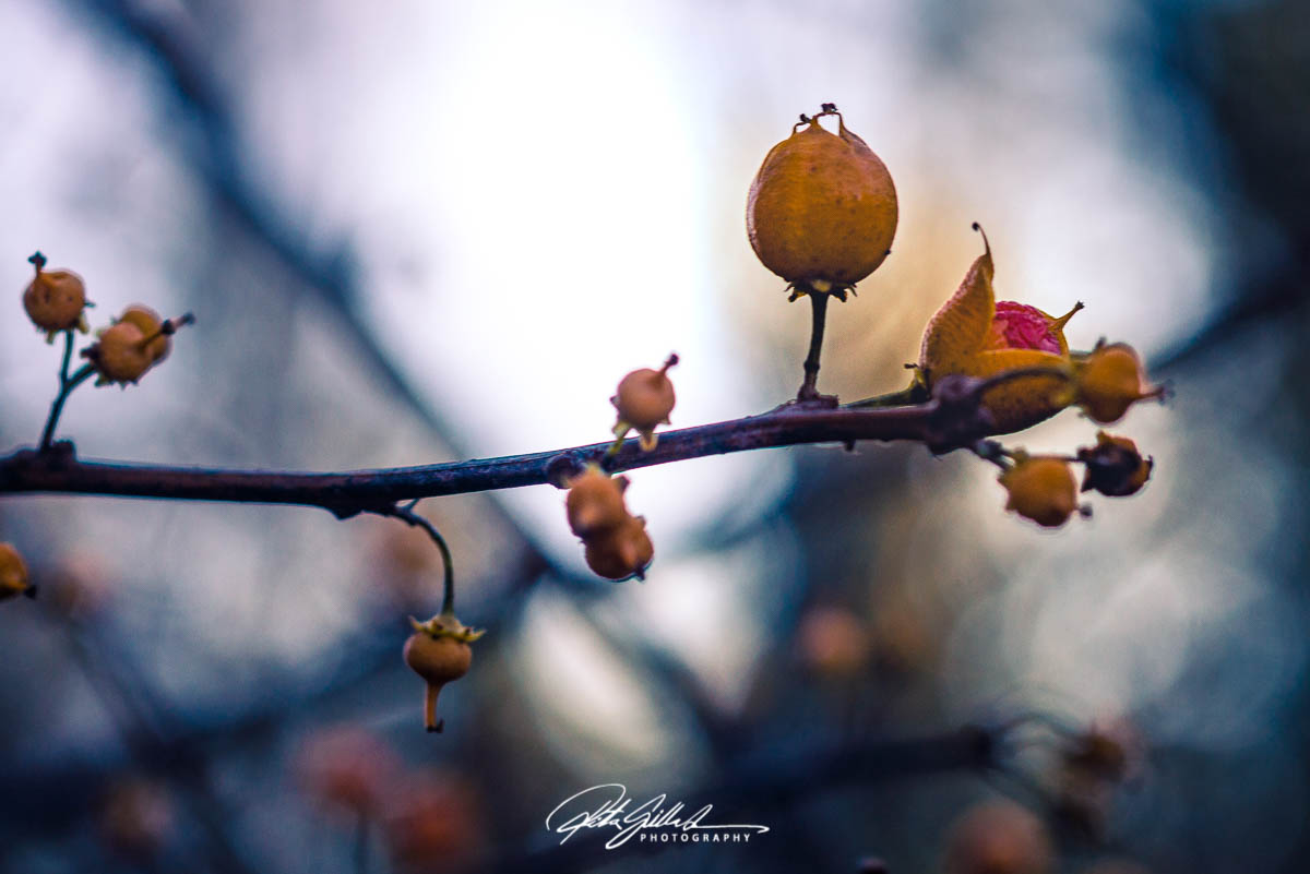 Close-up of colorful berries on a bare branch, showcasing the vibrant contrasts of late fall. Now we can cross over October 😀