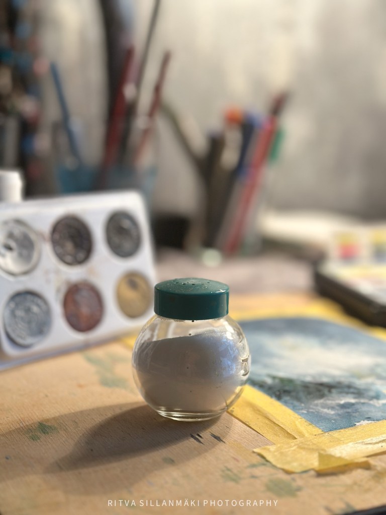 A salt shaker sits on an artist’s workspace, with art supplies as a background giving a, context to whu its on the desk