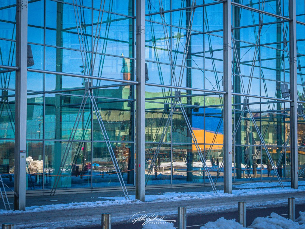 Music hall and Helsinki sign reflected from the opposite building Reflections on entrance to the Oodi library
