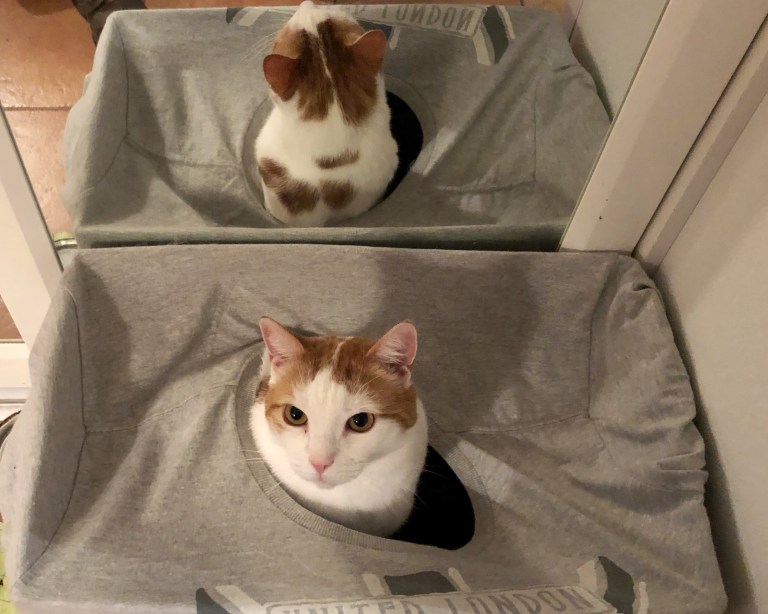 Ever so happy to have pets. My cats are saving me at the moment. I took my camera for an outing today, but to get photos out of the camera, let’s nitpick, from the memory card is the problem. Veikka, my beautiful white cat came to save the day. A cat in a Box. We have dressed a cardboard box with an old t- shirt in a our hall, funnily enough, our cats enjoy it.