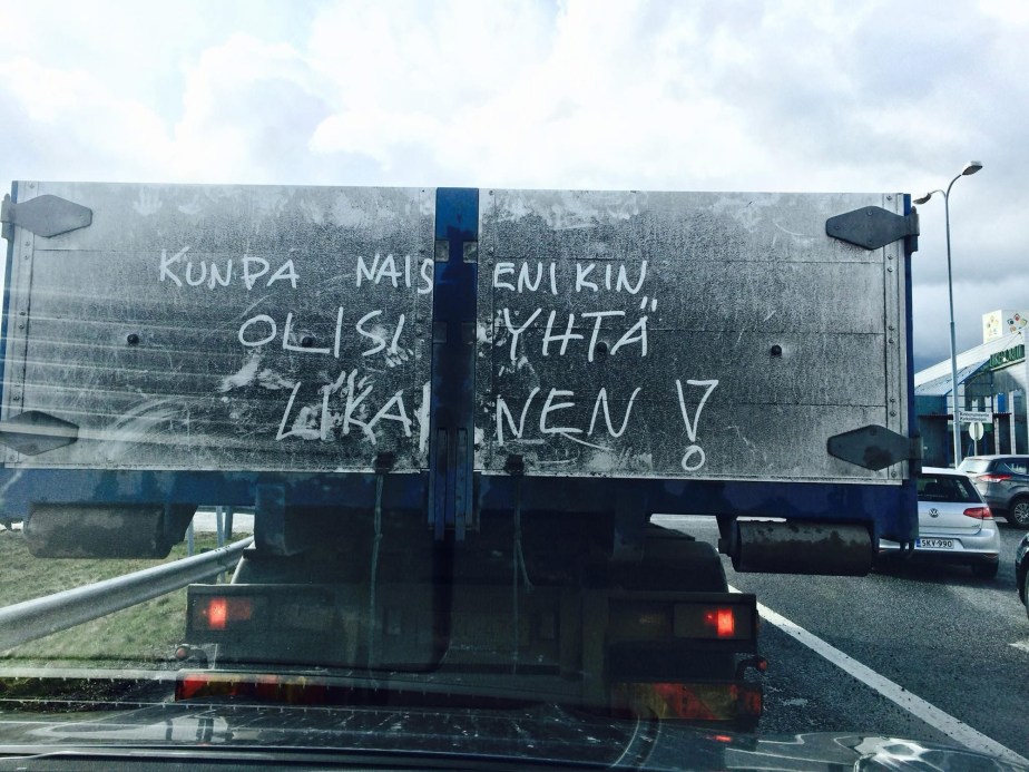 I must admit that initially, I found myself at a loss for photos for this challenge. I don’t have anything funny, and those I have are slightly on the naughty side, and I have no wish to offend anyone. 🙂 One would have been a photo of a very dirty truck that someone had written on in Finnish (another little hiccup for many). I wish my woman’s was as dirty as this truck. Not to everyone’s taste. Still here it is 🙂