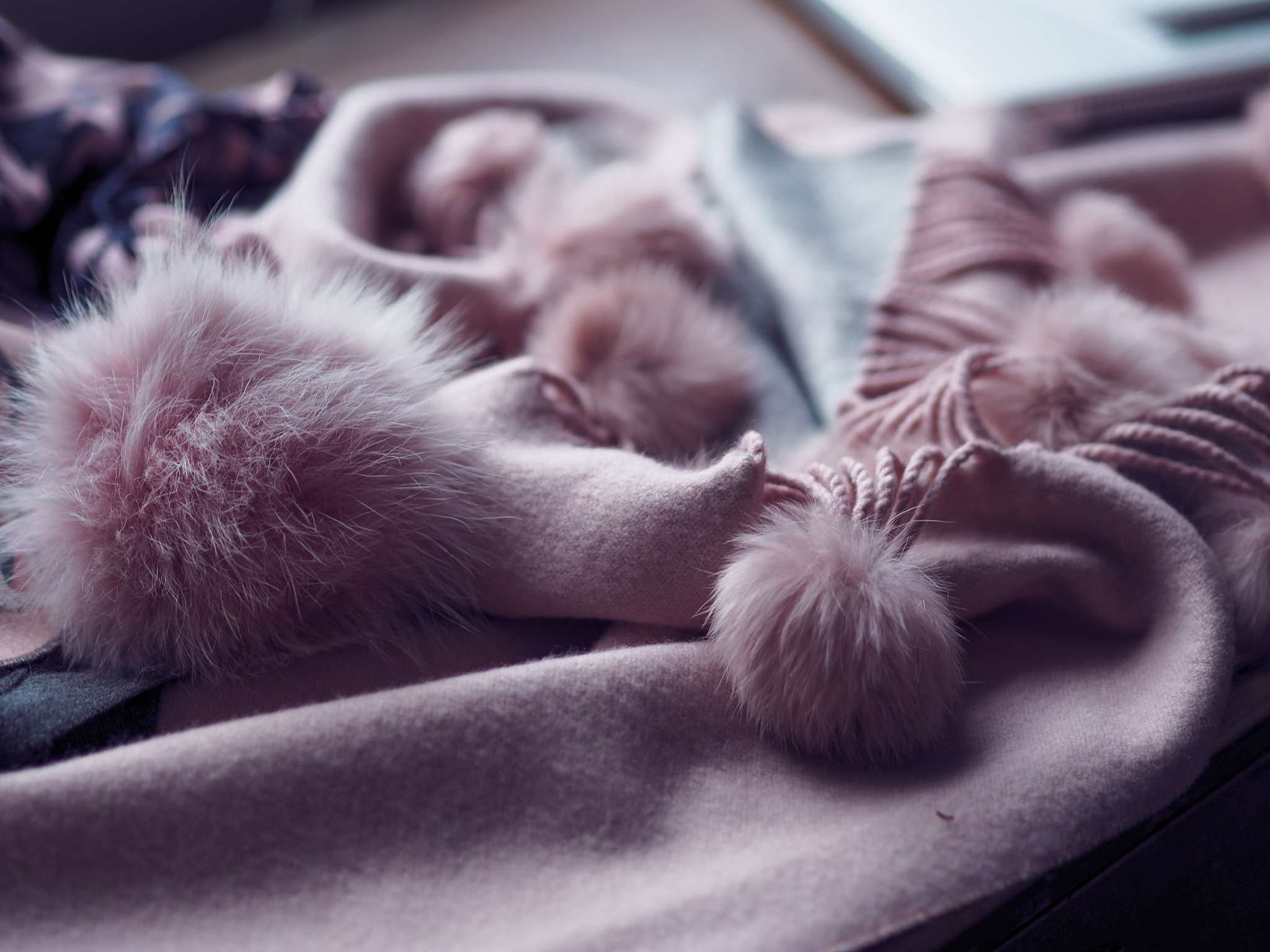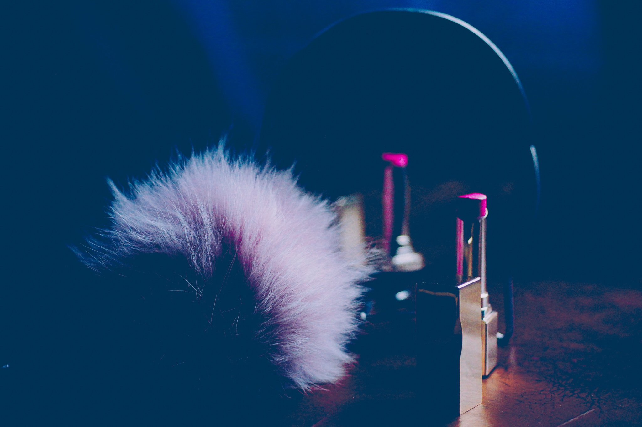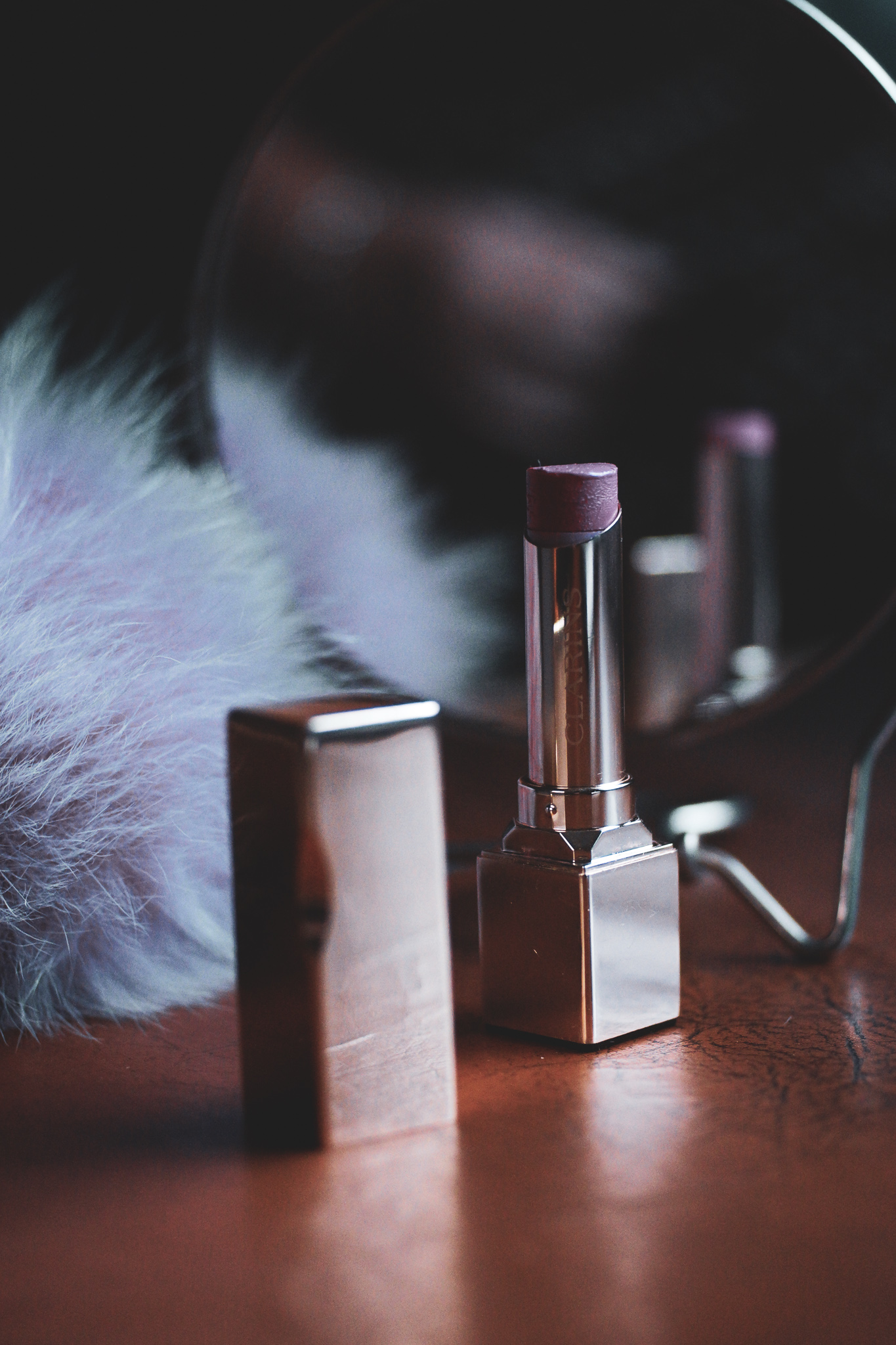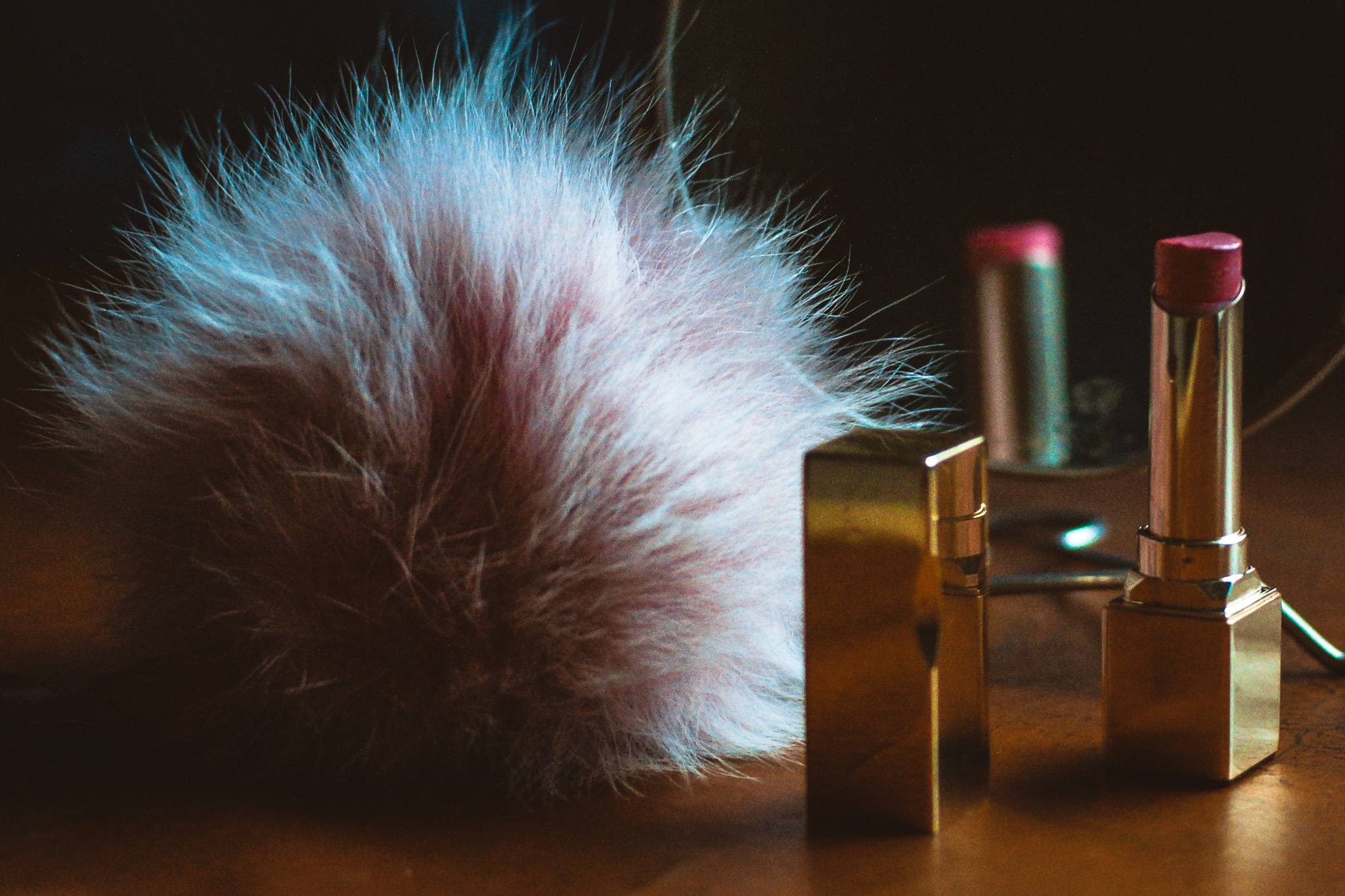 A close-up of pink lipstick tube alongside a fluffy pink accessory, embodying a feminine and stylish aesthetic.