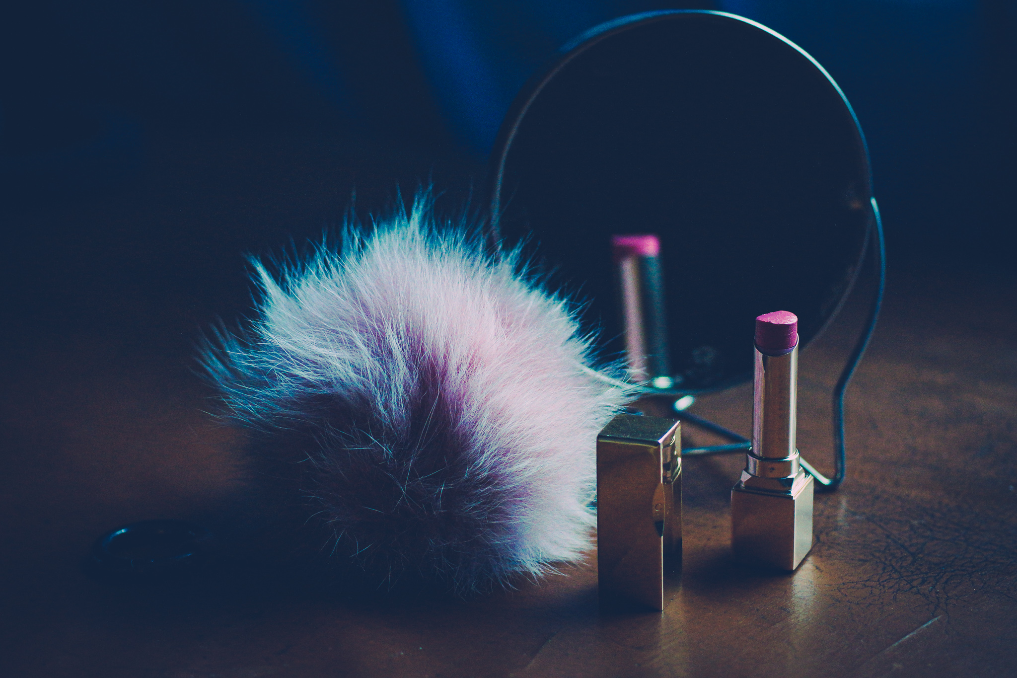 Makeup essentials, pink lipstick, a soft pom-pom, and a compact mirror.
