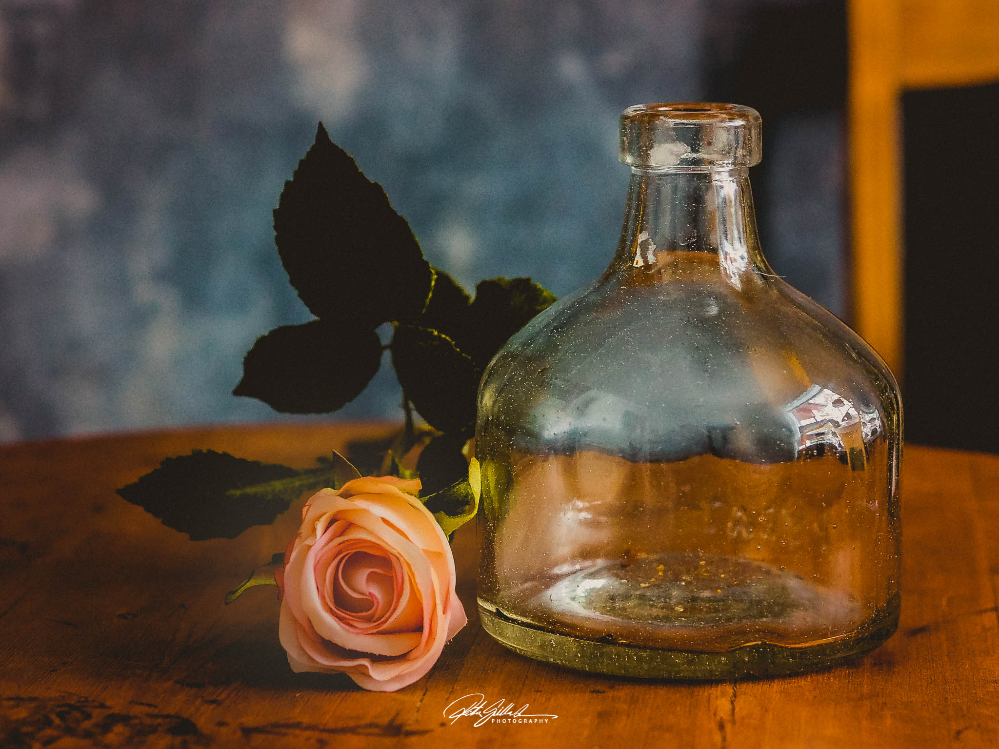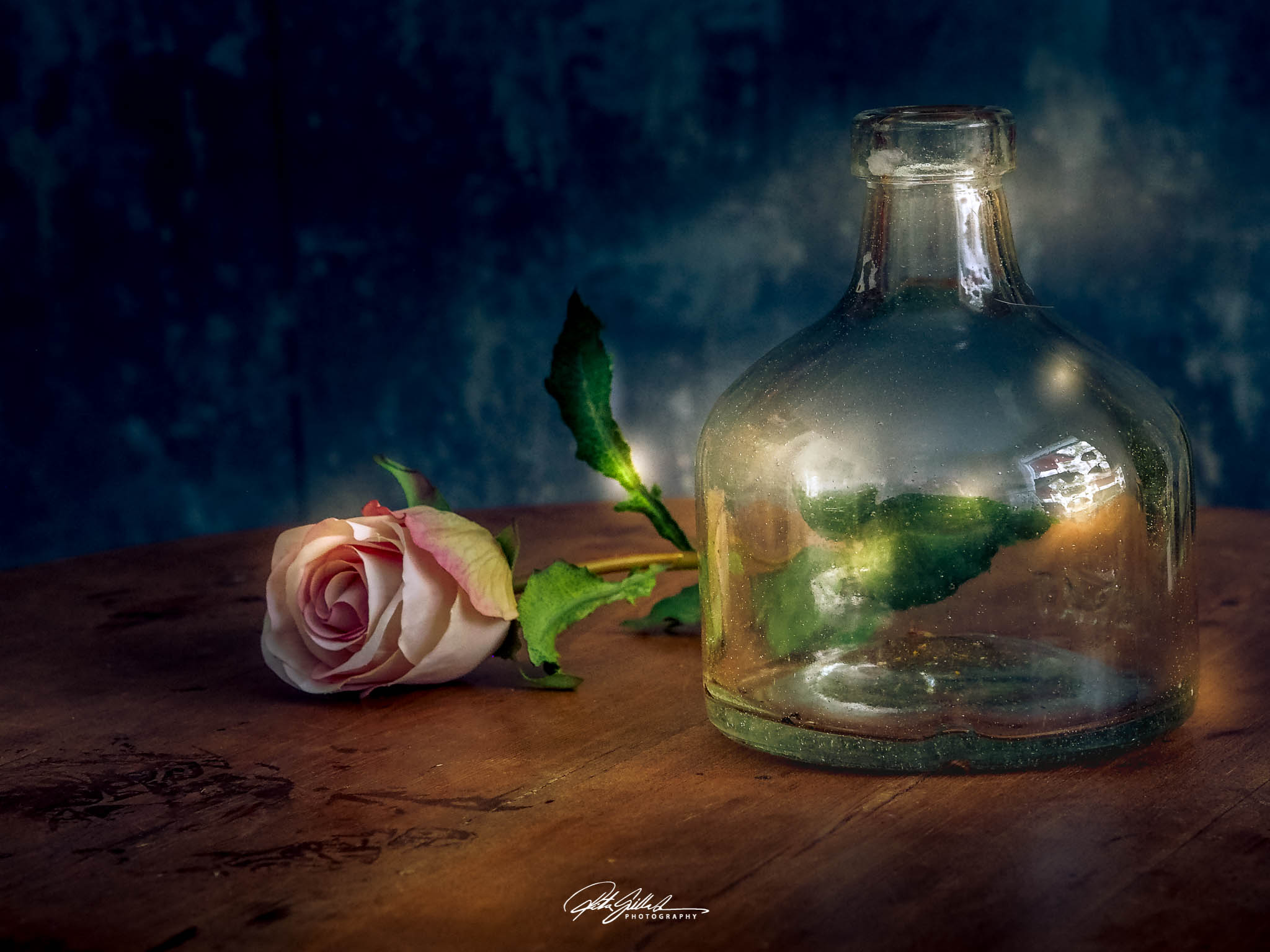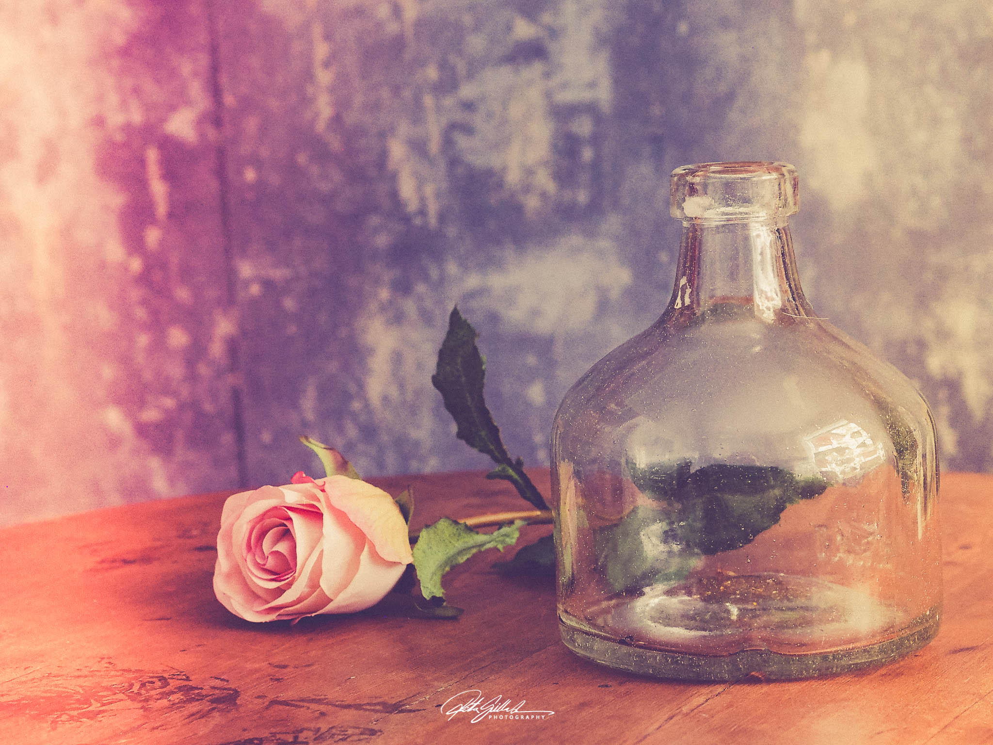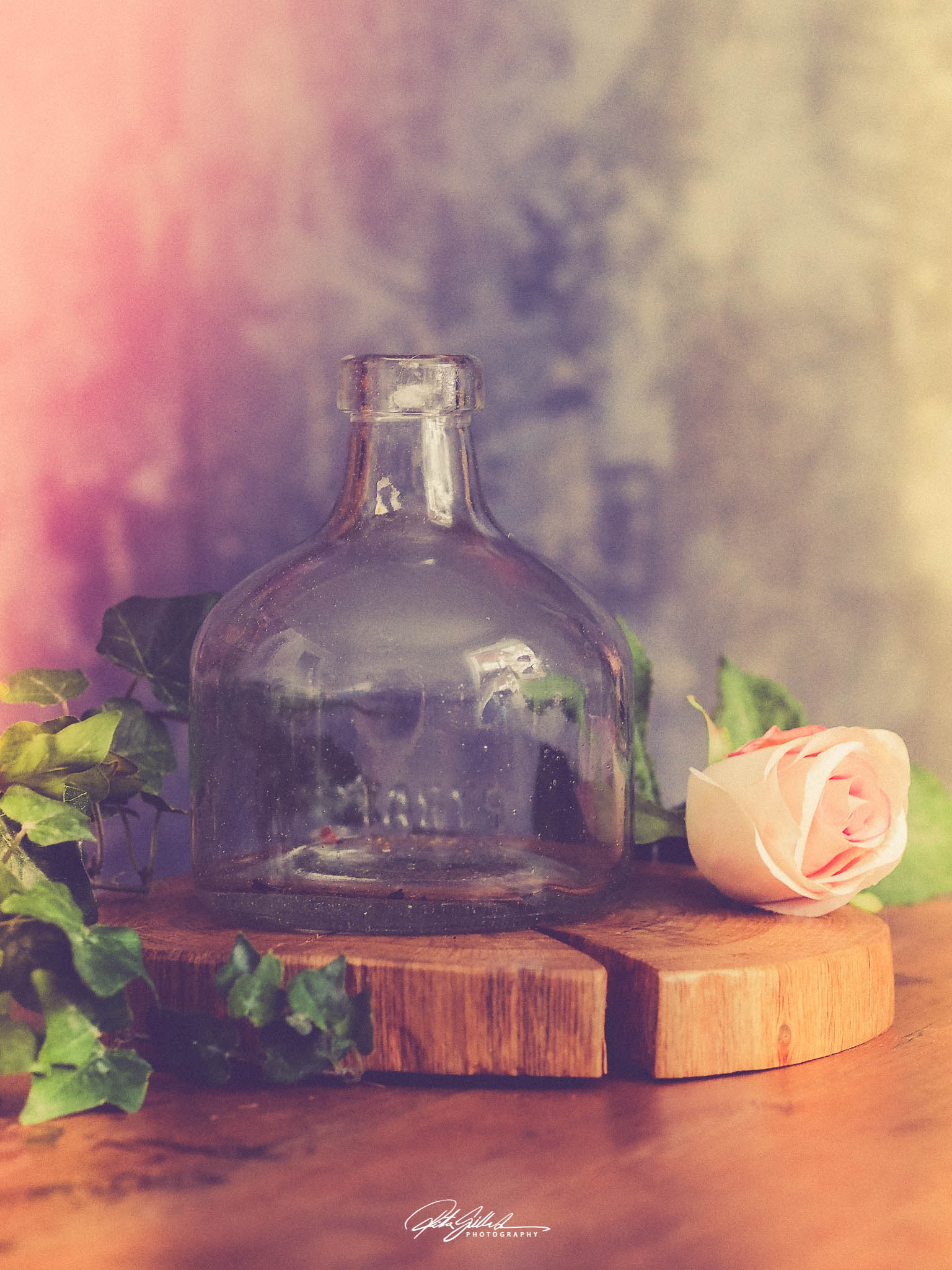 A Bottle, Rose, greens and a kettle holder. Shadow and light. Color play.