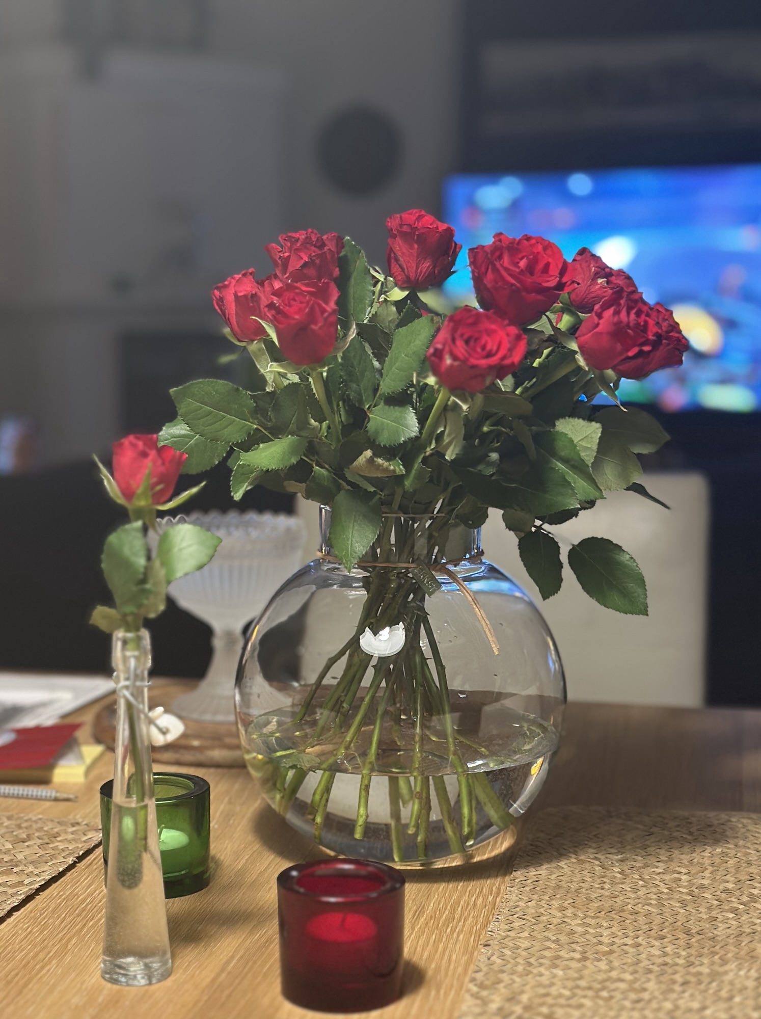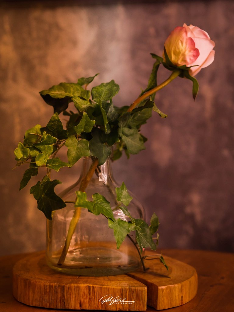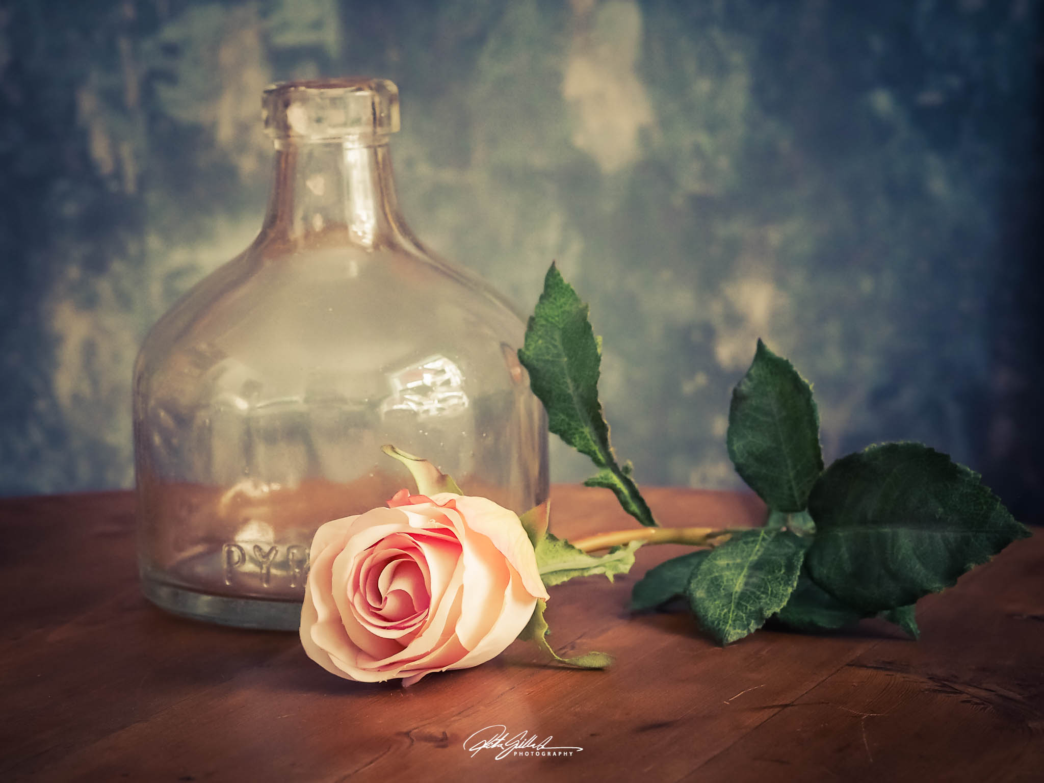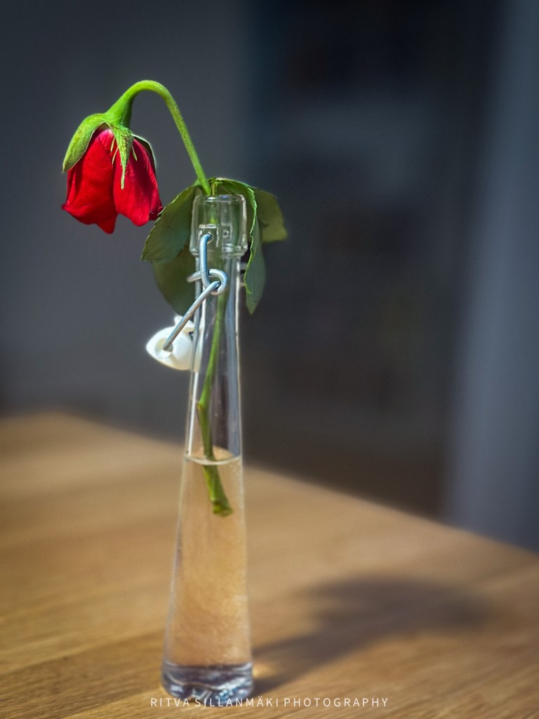 A Bottle, Rose, greens and a kettle holder. Shadow and light. Color play.