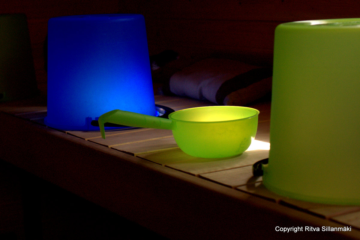 Oddly enough, I was the one warming the sauna… usually not done by me. I still had my camera with me so I took photo of our water buckets. I kiked how the light made them stand out. ODD shot.