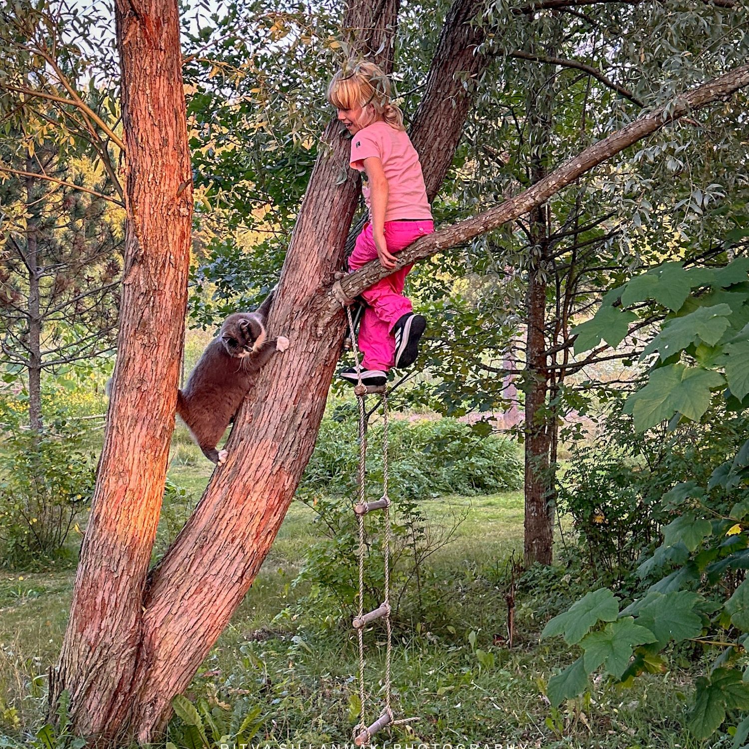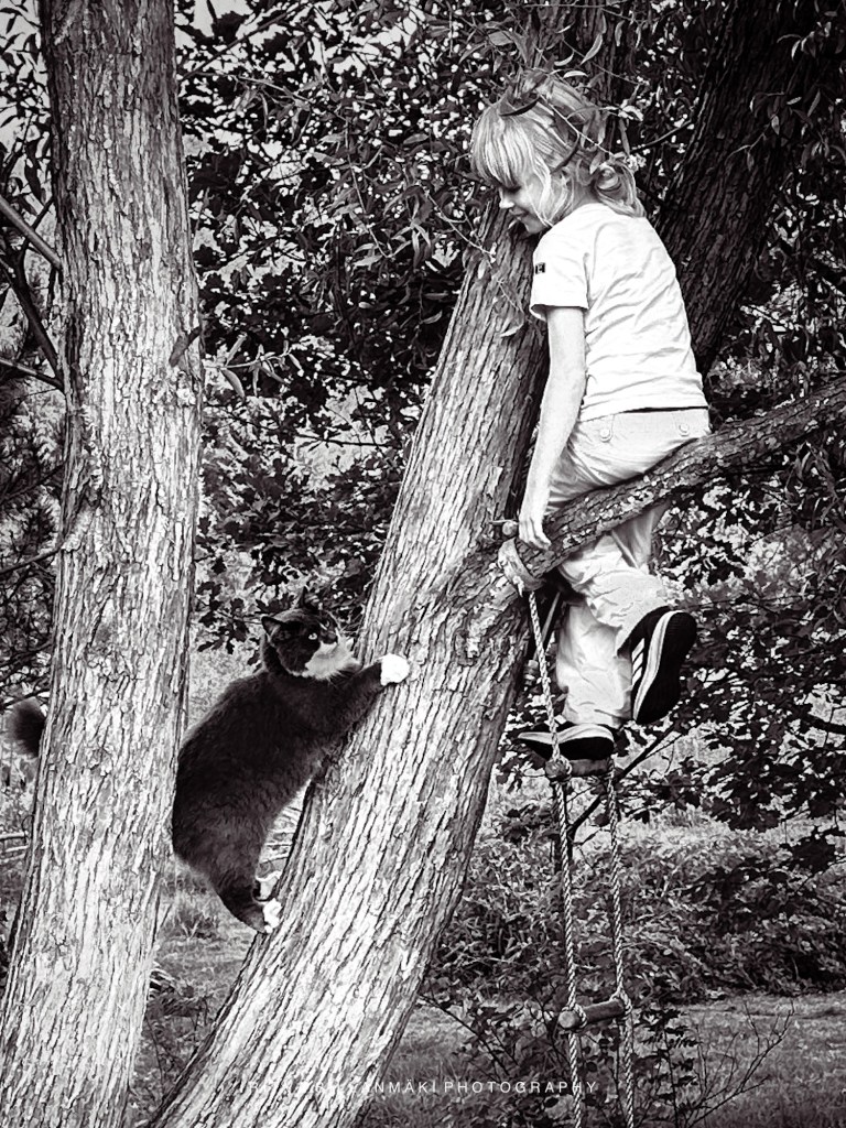 SevenforSeptember. I took this yesterday evening at 18:51, just before seven, but what can you do, it was not staged 🙂 after having coffee with our neighbour. The sun light was soft golden hues. Their 7 year old first grader caught my eye as she climbed a tree, her vibrant energy filling the air. To my surprise, her curious cat followed suit, making for a charming sight – a pretty girl and her feline friend perched in the branches, the embodiment of childhood adventure and companionship.