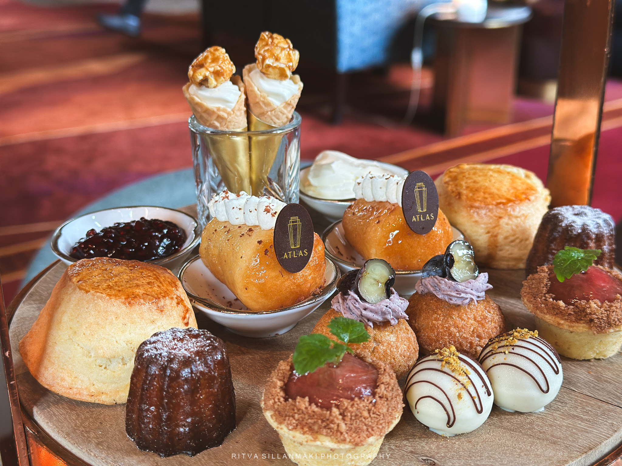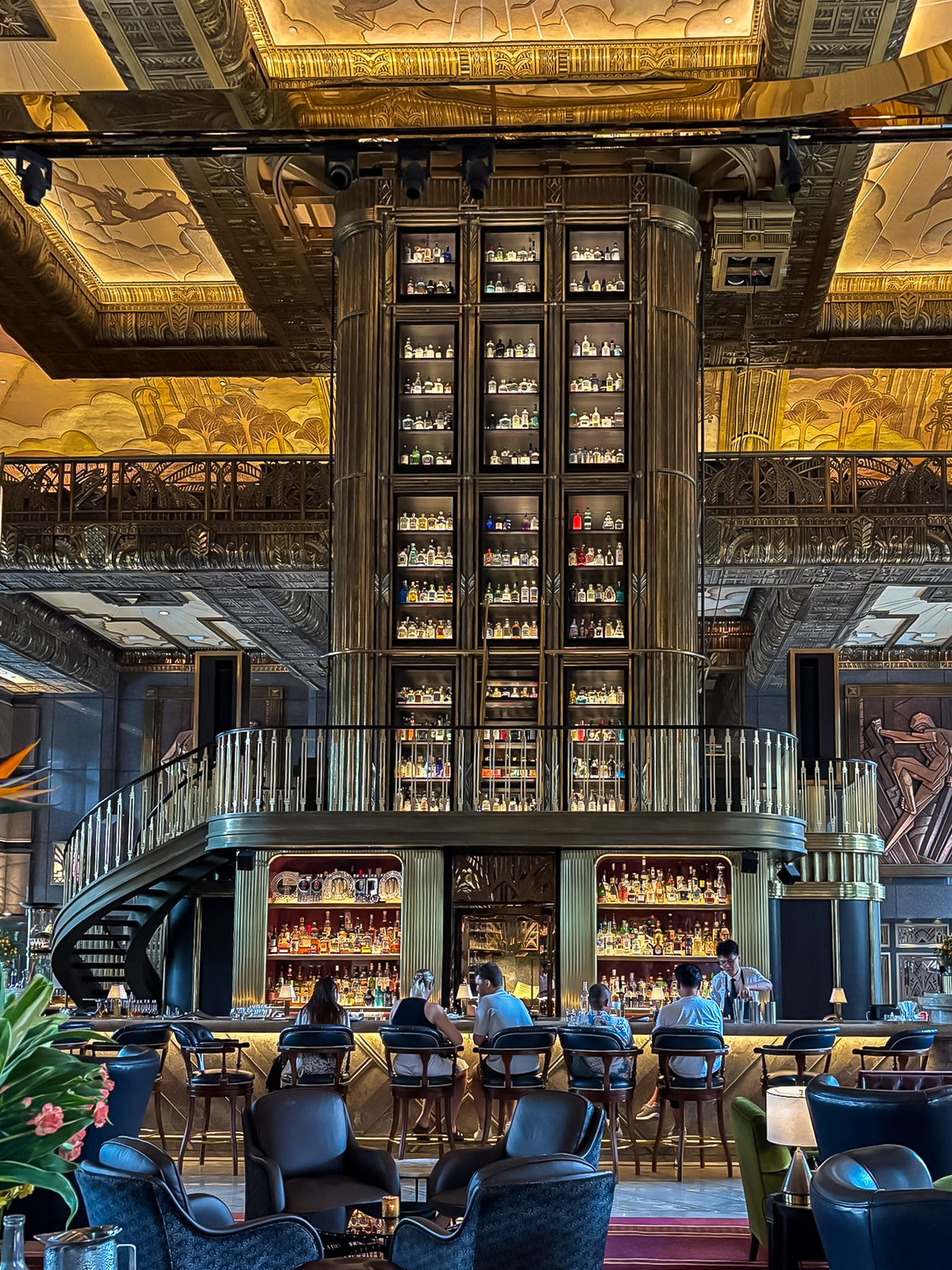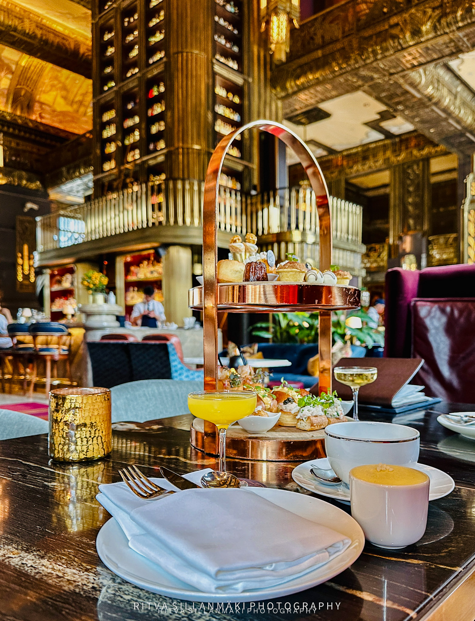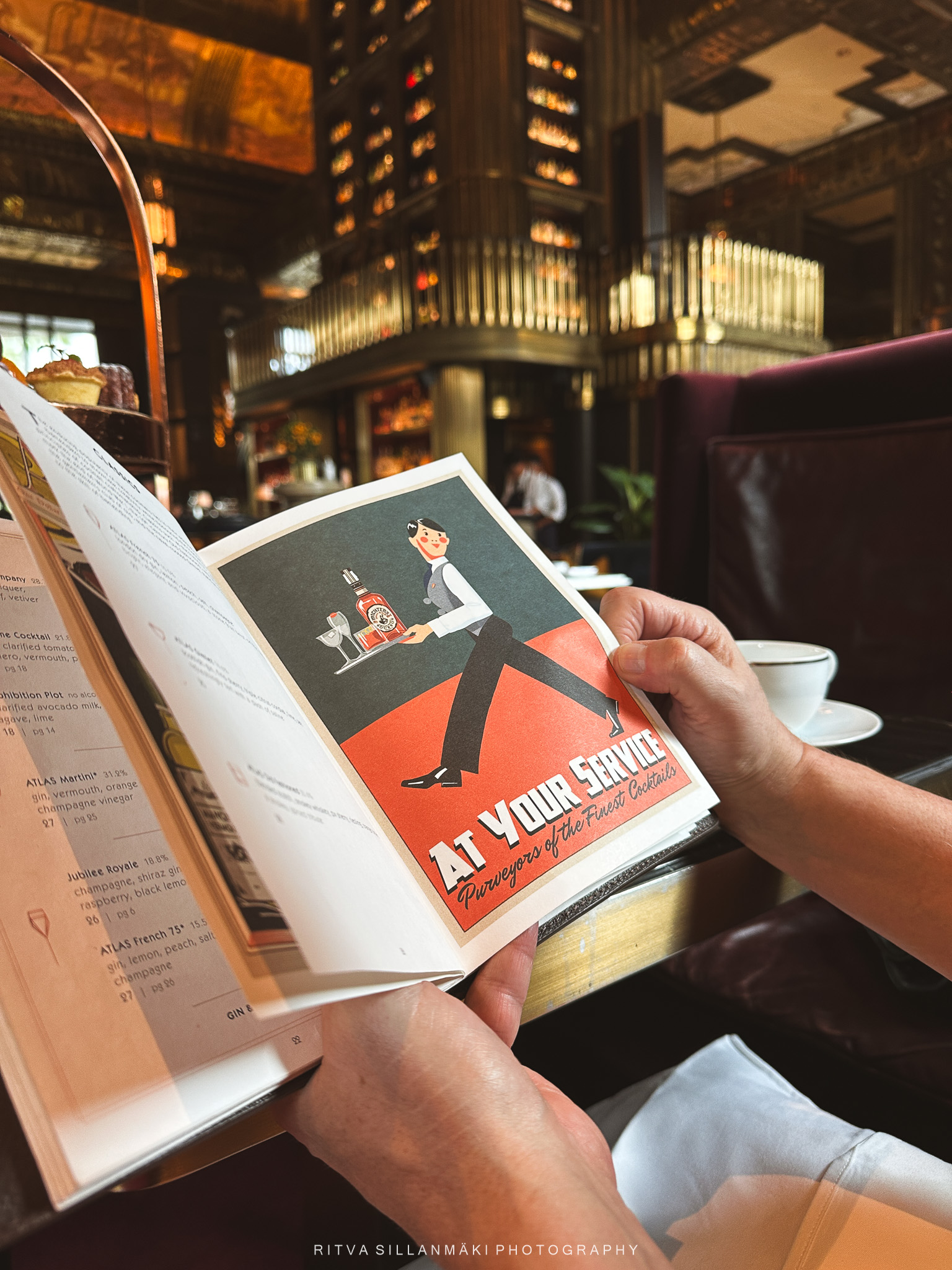We had reserved an afternoon tea at 3 pm, so in we go. Reservations for the afternoon tea are always recommended because the bar can be fully booked. Inside of the ATLAS Bar was even more stunning. I couldn’t take my eyes off the centerpiece bar, the magnificent tower of gin, located at the far end of the area. The tower holds over 1300 gins and is two stories high. I can only guess how they get the bottles down from the tower. When we were present, I didn’t see any acrobats climbing the structure and flinging down bottles to bartenders.