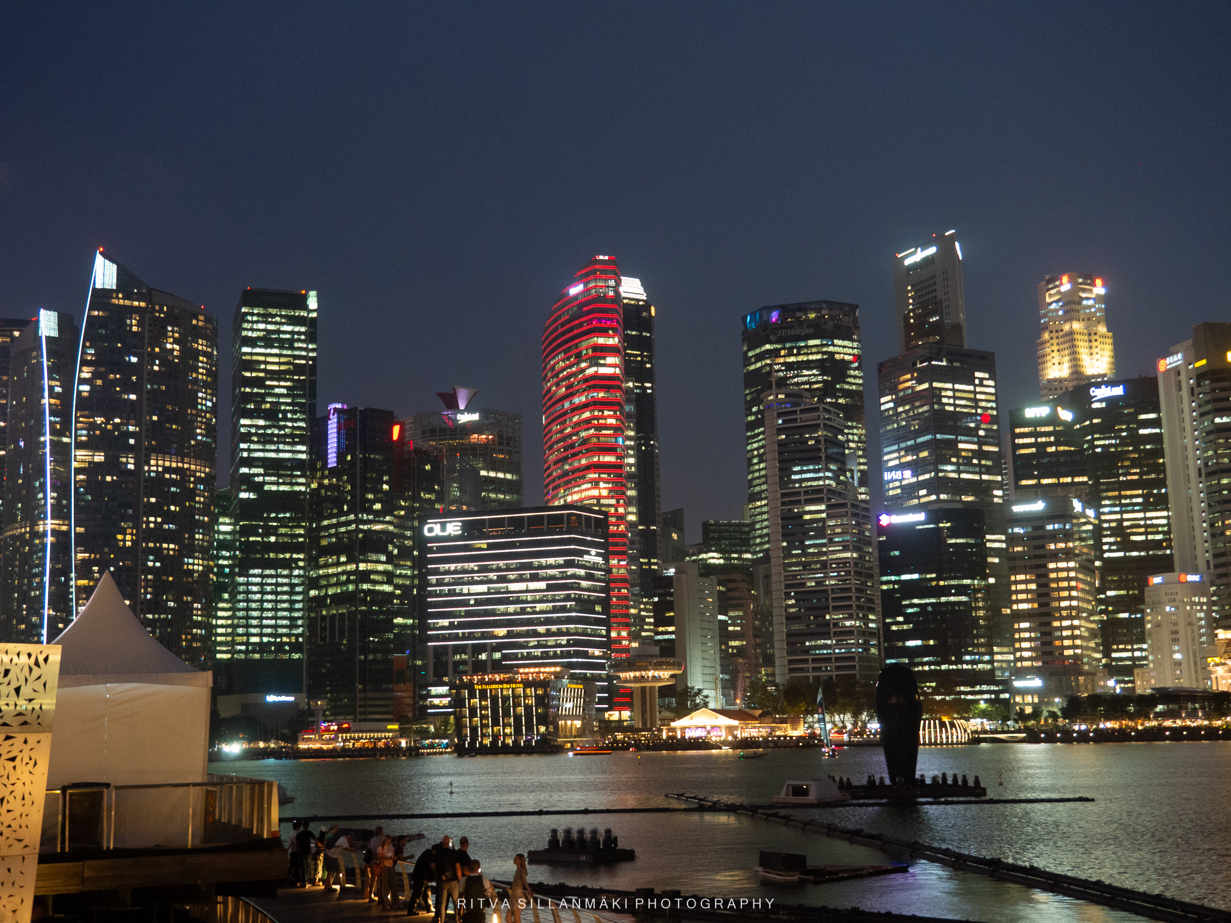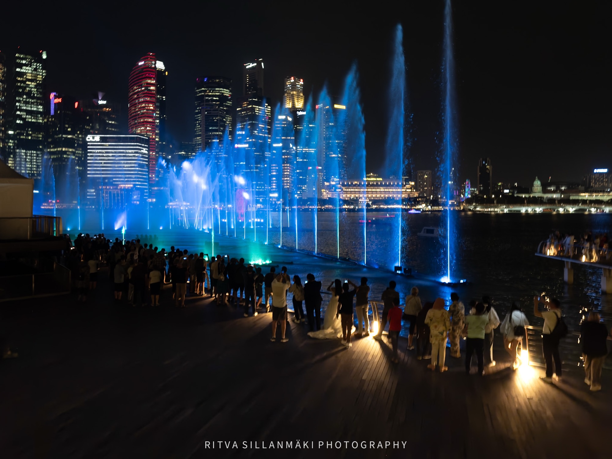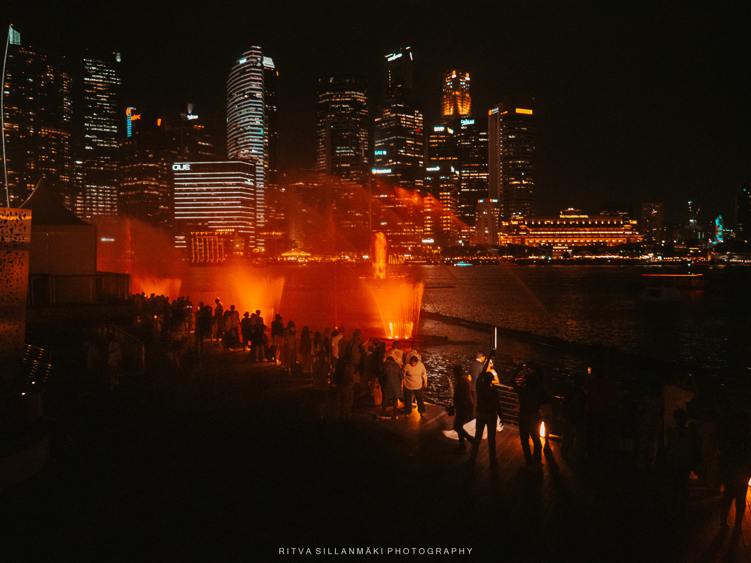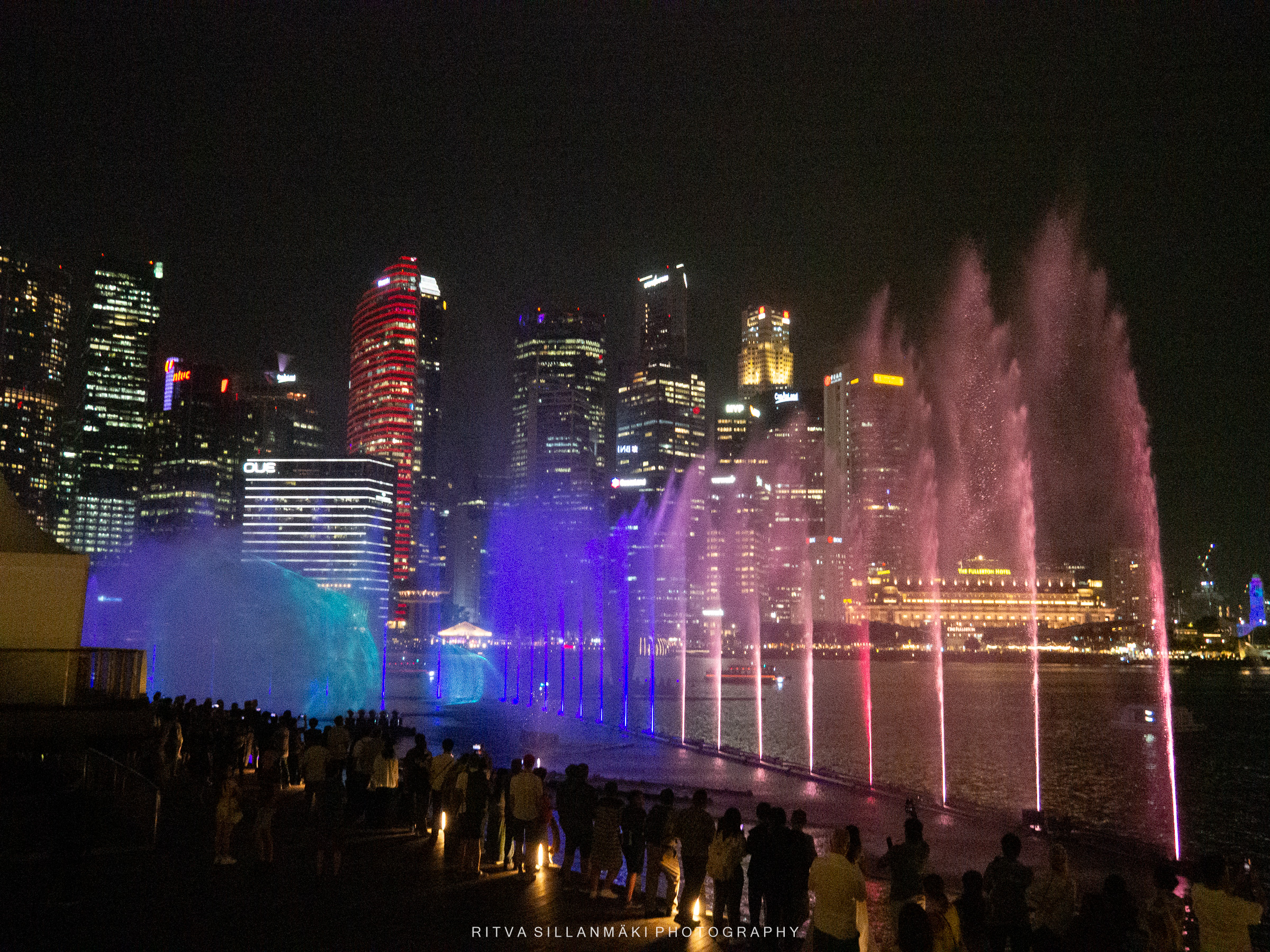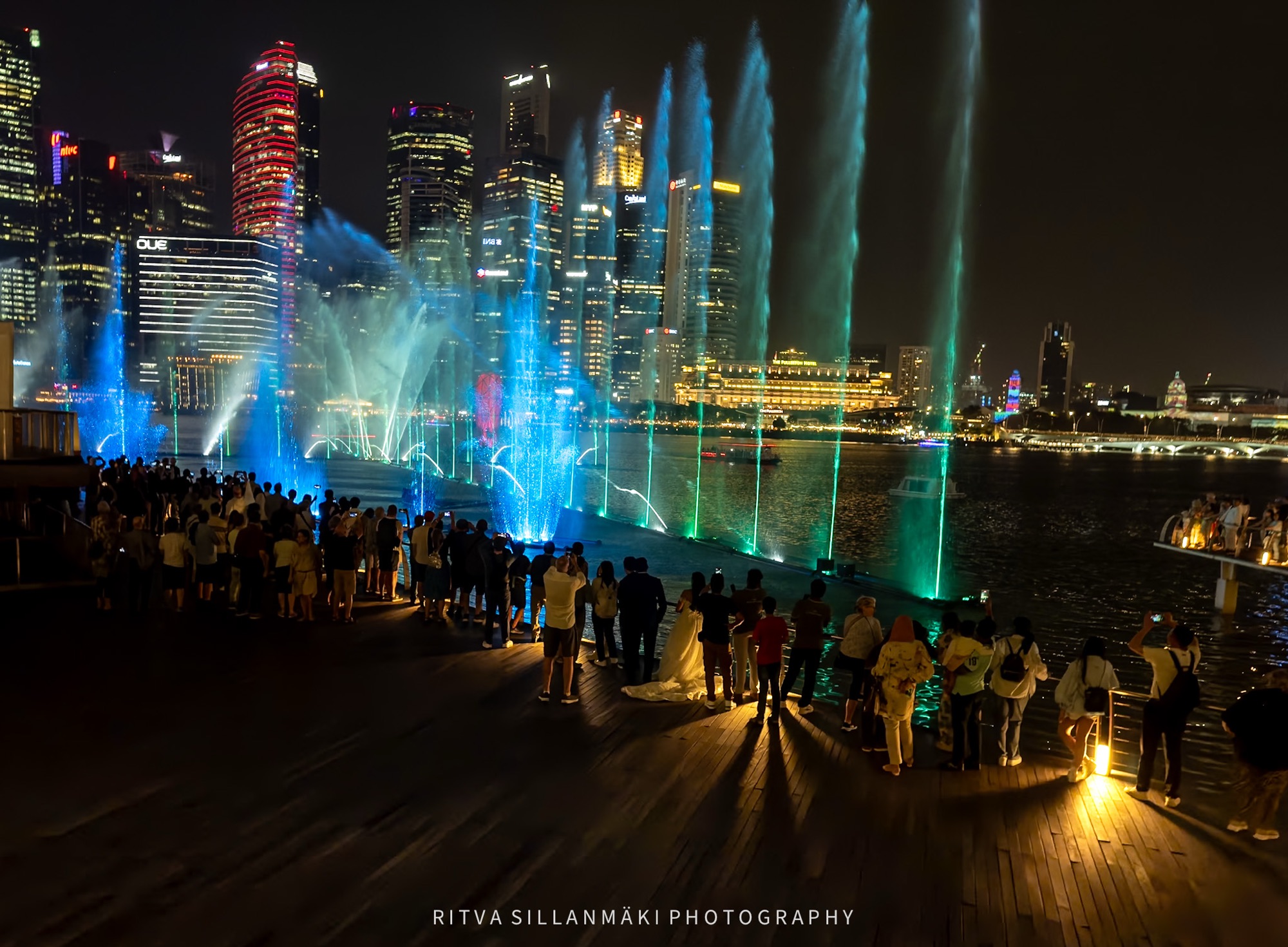 To capture the Water and Light Show in Marina Bay was also hard. The lit skyscrapers as a backdrop were obviously nice but documenting the show proved to be challenging. What was really fun however was that the show was so close to the event area that you got wet by the showers from the fountains. People in the know were prepared with raincoats and umbrellas but I wasn’t wise enough. Fortunately, it was a warm night. It goes without saying that the area was a really popular spot for photographers. We saw wedding and fashion pictures taken by the bay.