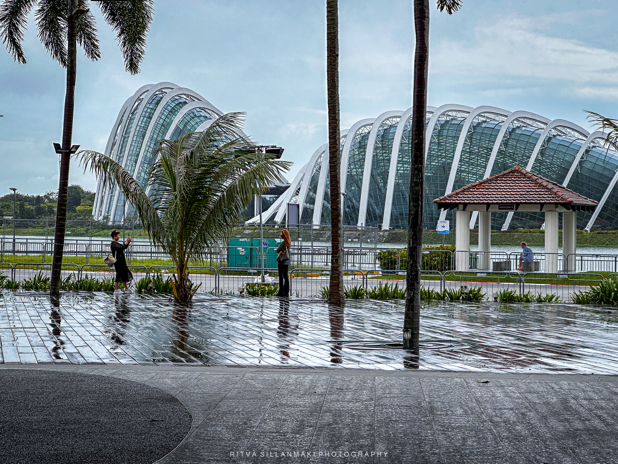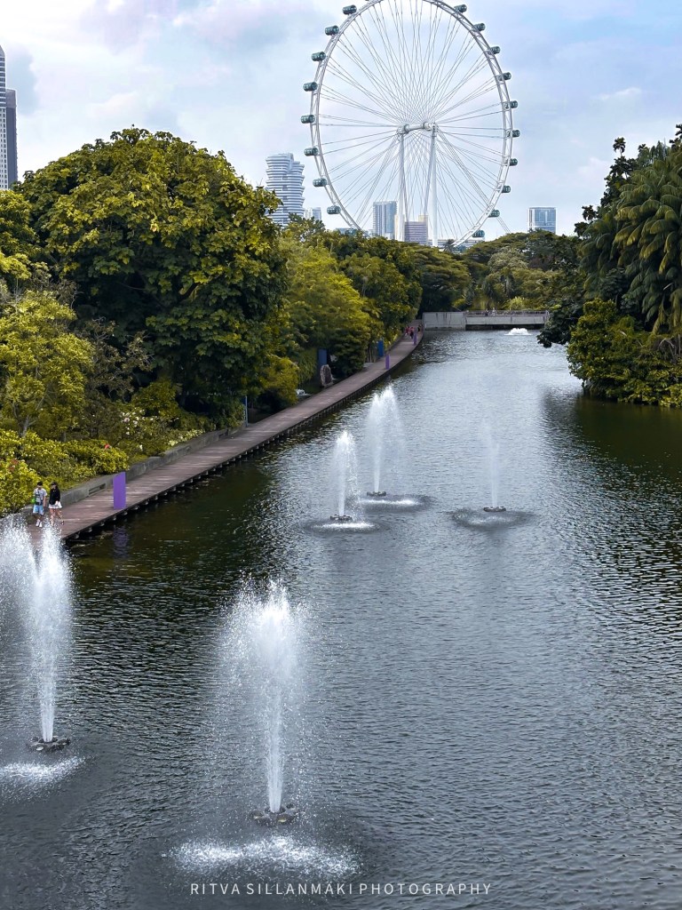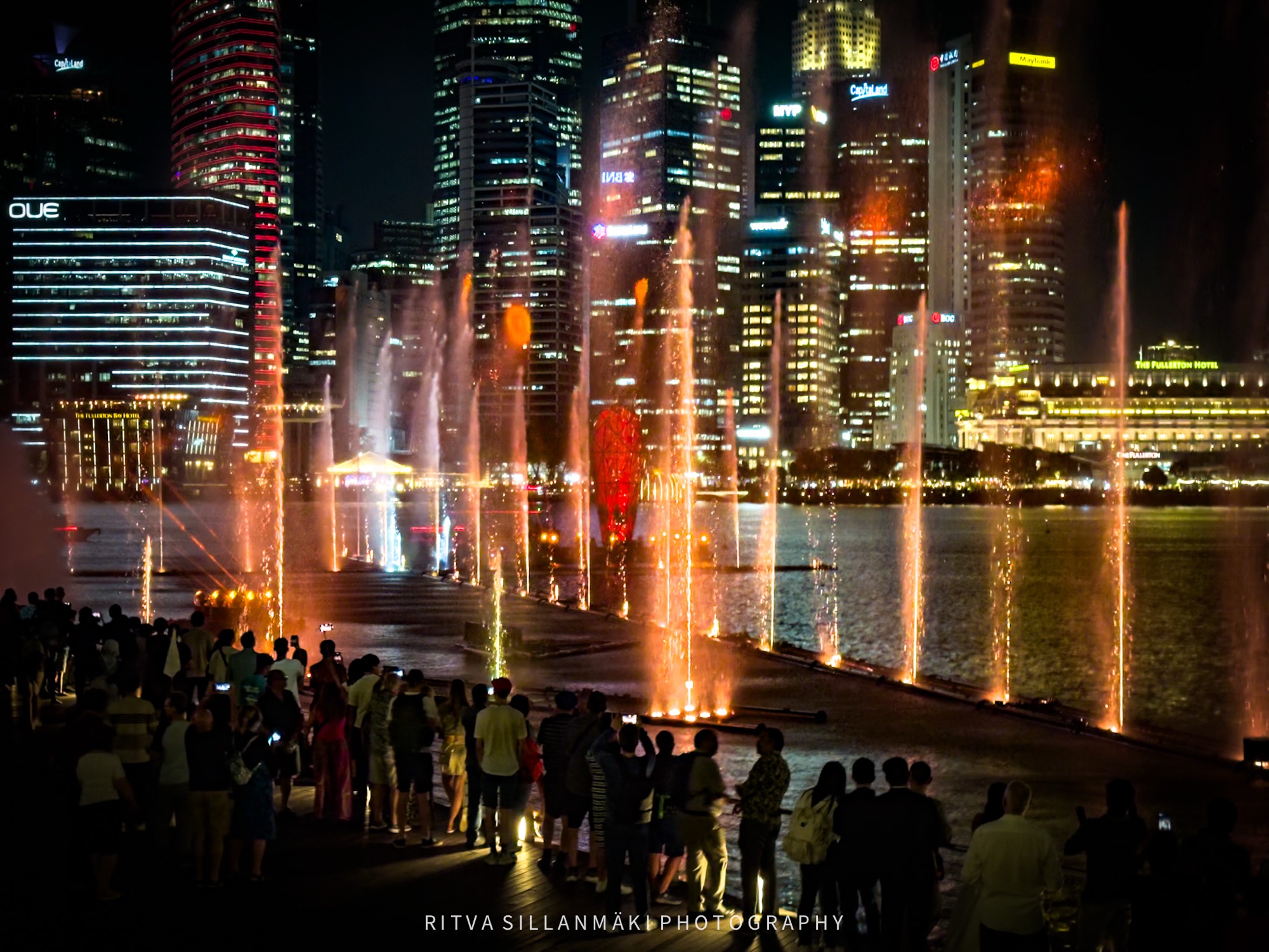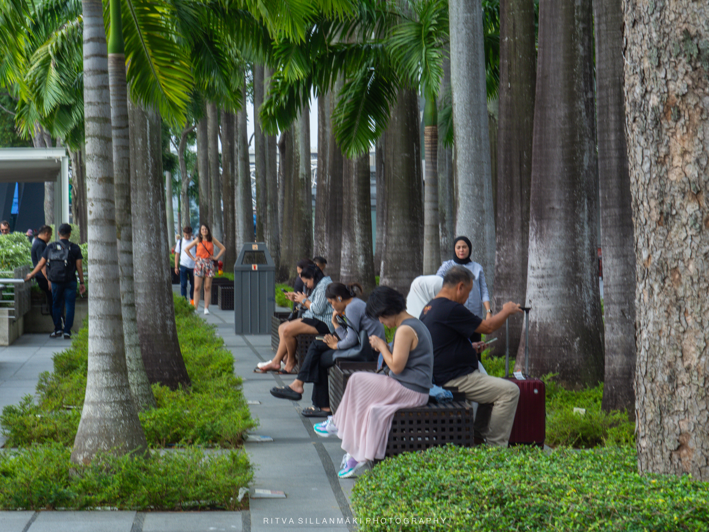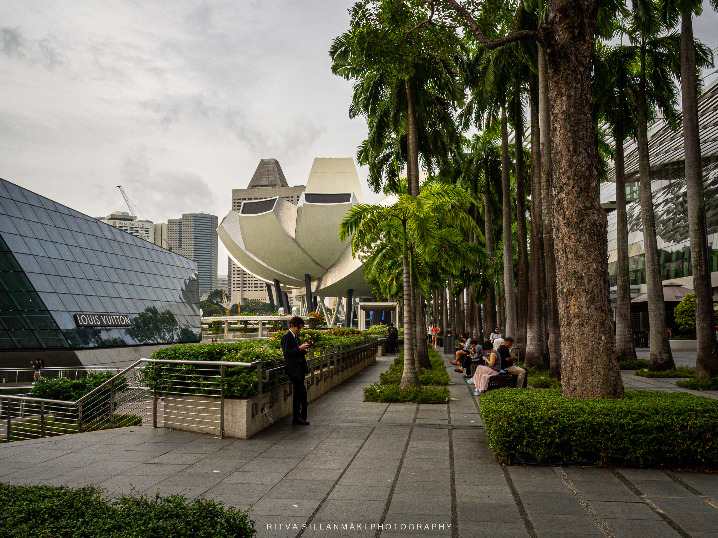 To capture the Water and Light Show in Marina Bay was also hard. The lit skyscrapers as a backdrop were obviously nice but documenting the show proved to be challenging. What was really fun however was that the show was so close to the event area that you got wet by the showers from the fountains. People in the know were prepared with raincoats and umbrellas but I wasn’t wise enough. Fortunately, it was a warm night. It goes without saying that the area was a really popular spot for photographers. We saw wedding and fashion pictures taken by the bay.