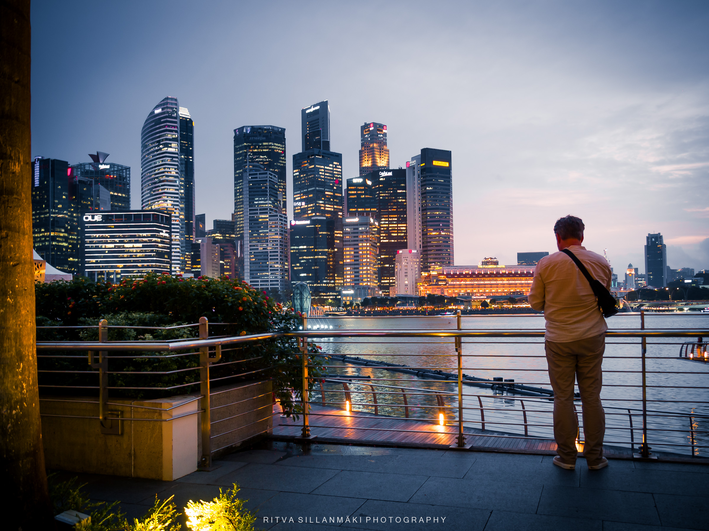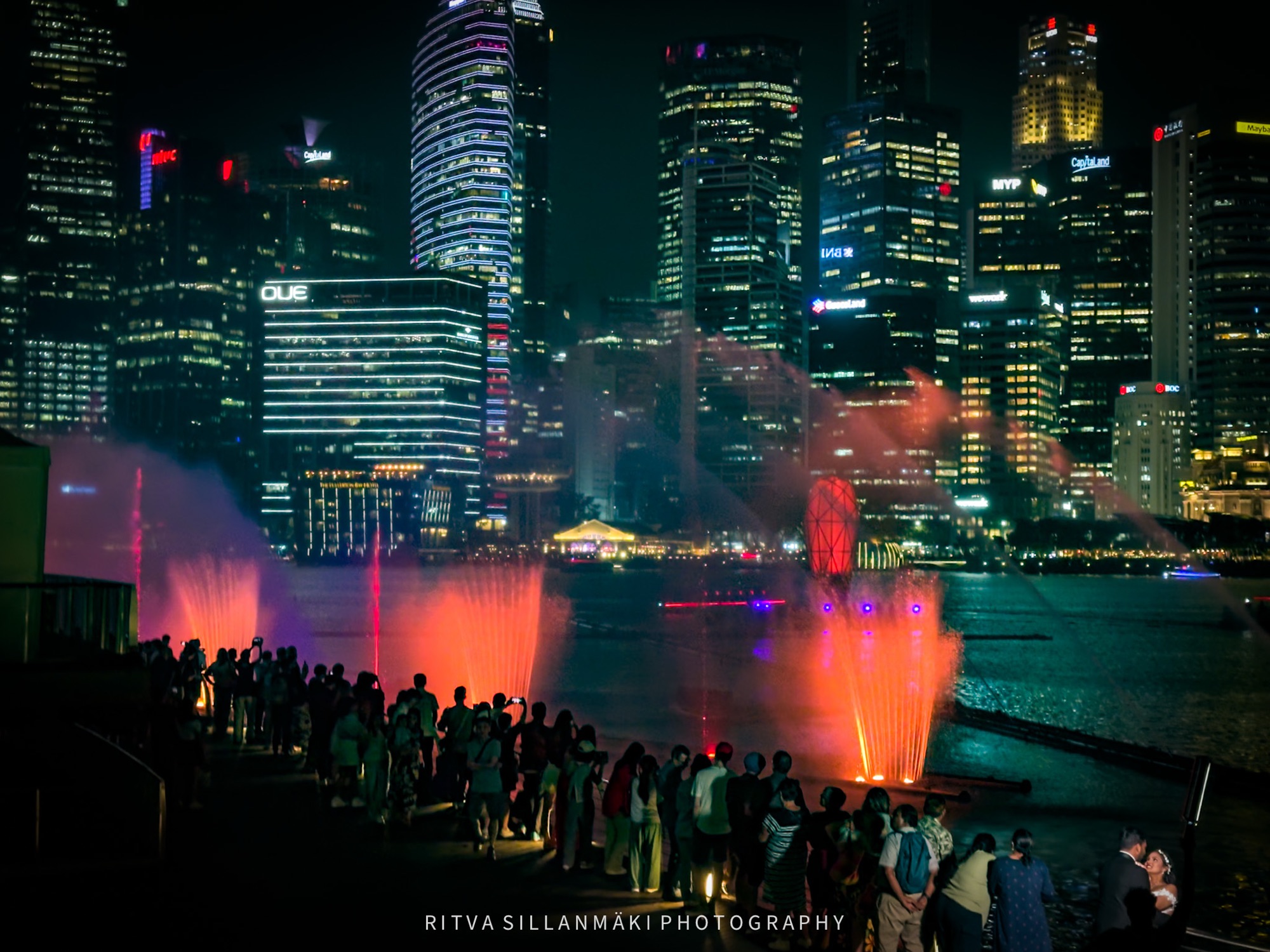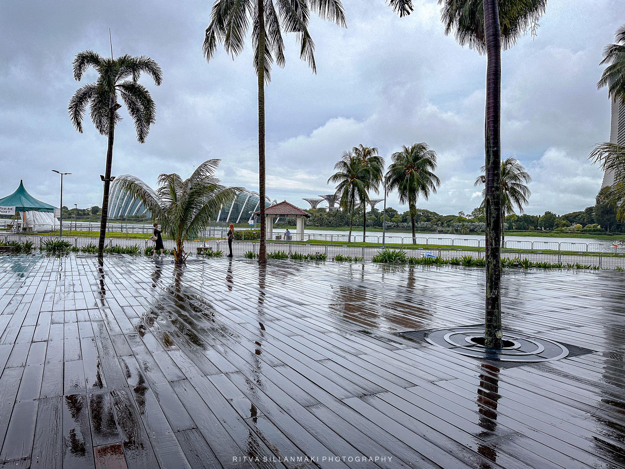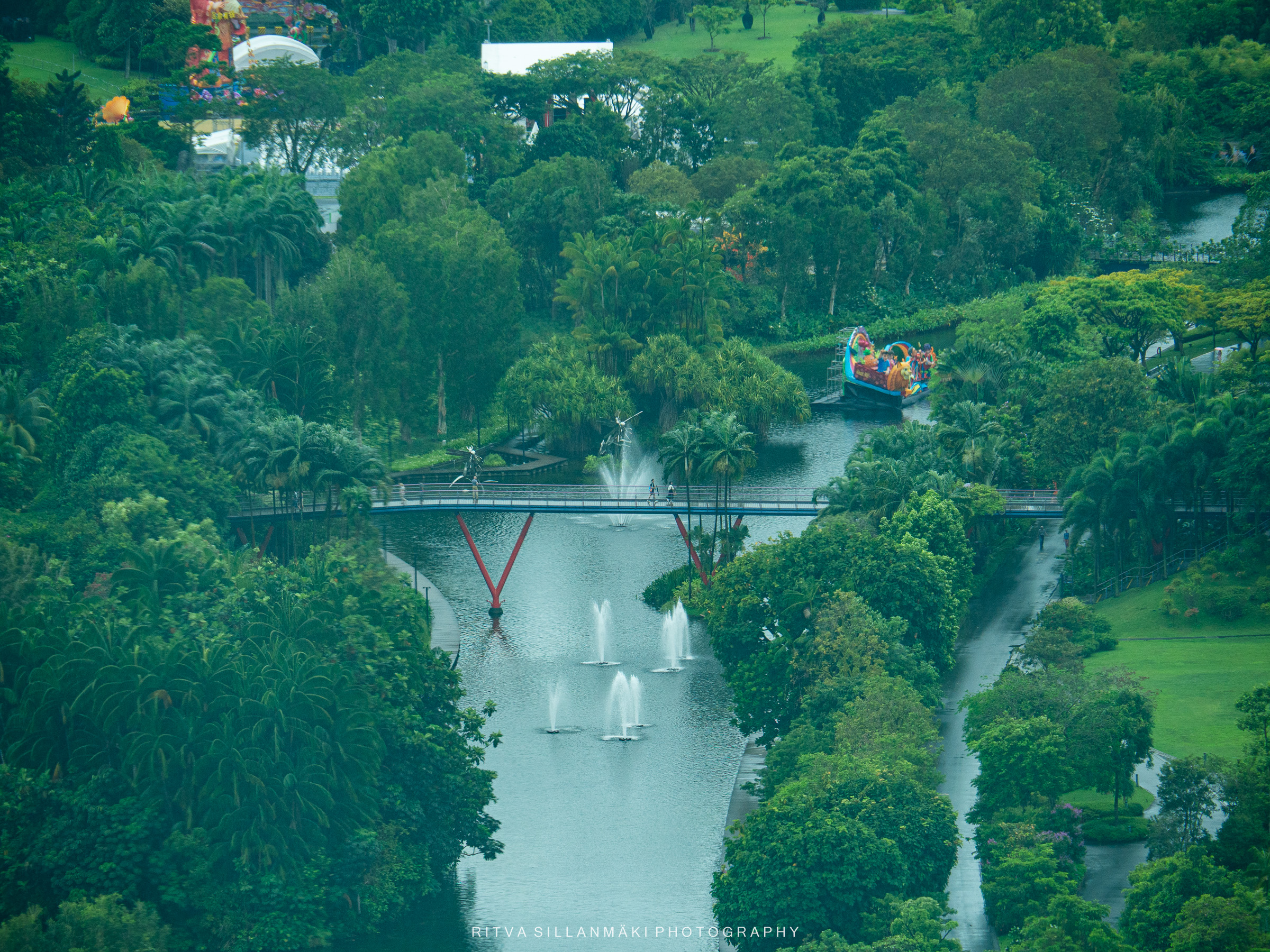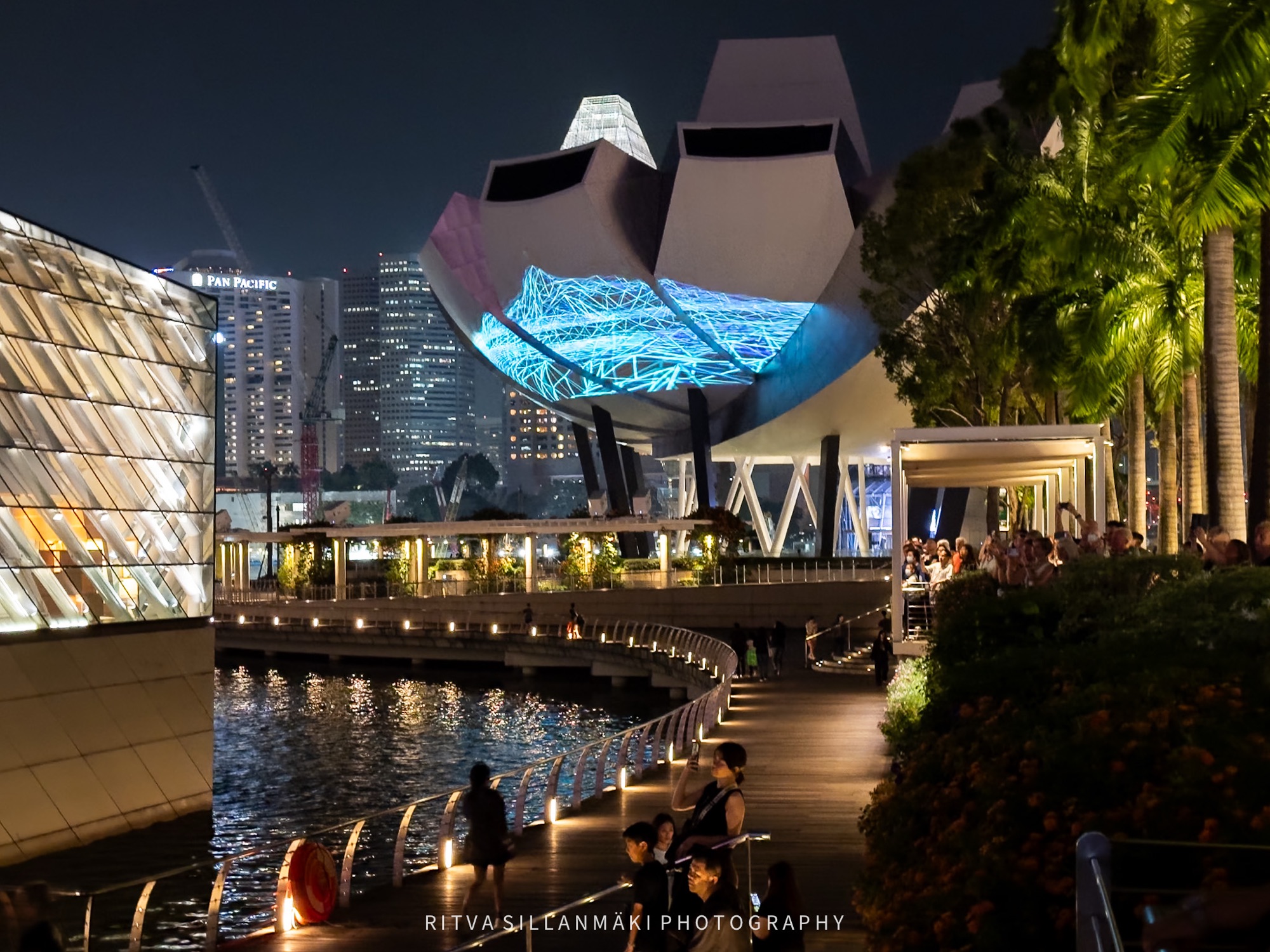 To capture the Water and Light Show in Marina Bay was also hard. The lit skyscrapers as a backdrop were obviously nice but documenting the show proved to be challenging. What was really fun however was that the show was so close to the event area that you got wet by the showers from the fountains. People in the know were prepared with raincoats and umbrellas but I wasn’t wise enough. Fortunately, it was a warm night. It goes without saying that the area was a really popular spot for photographers. We saw wedding and fashion pictures taken by the bay.