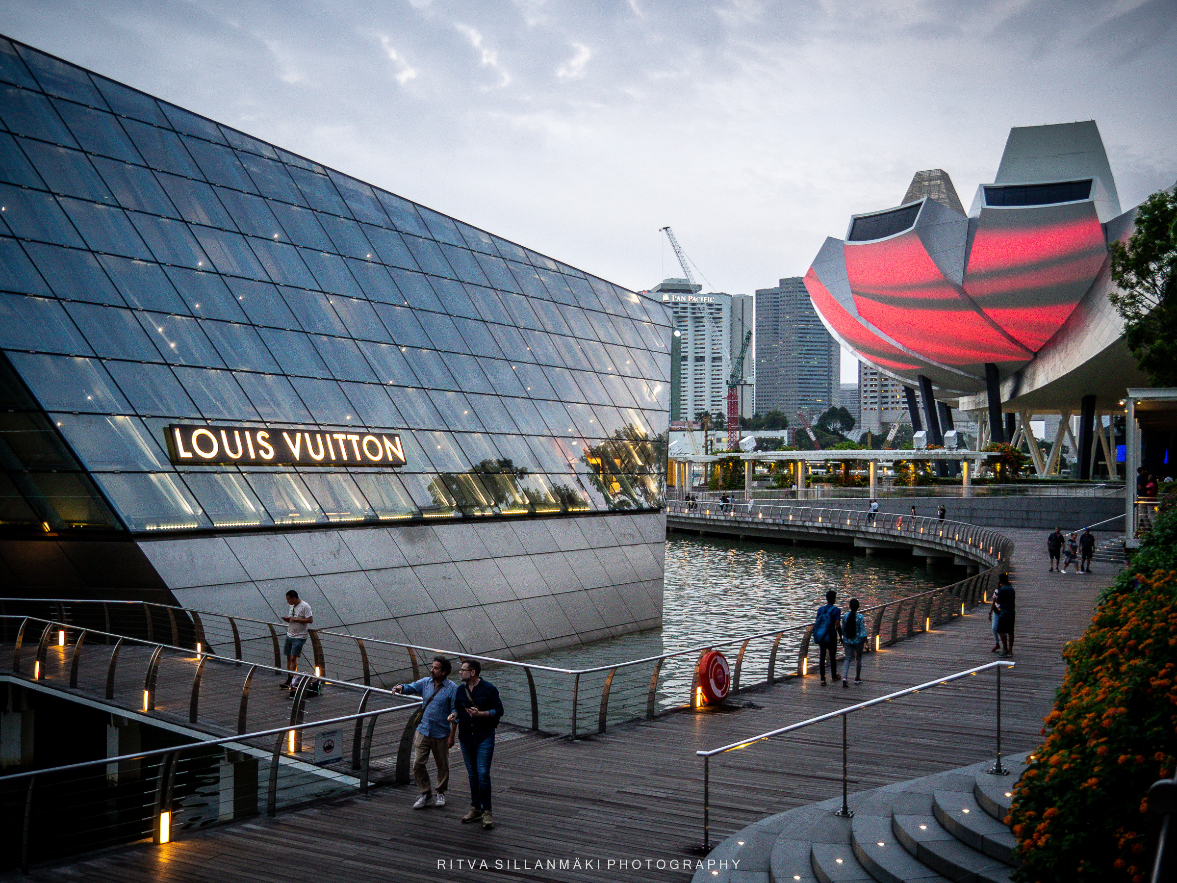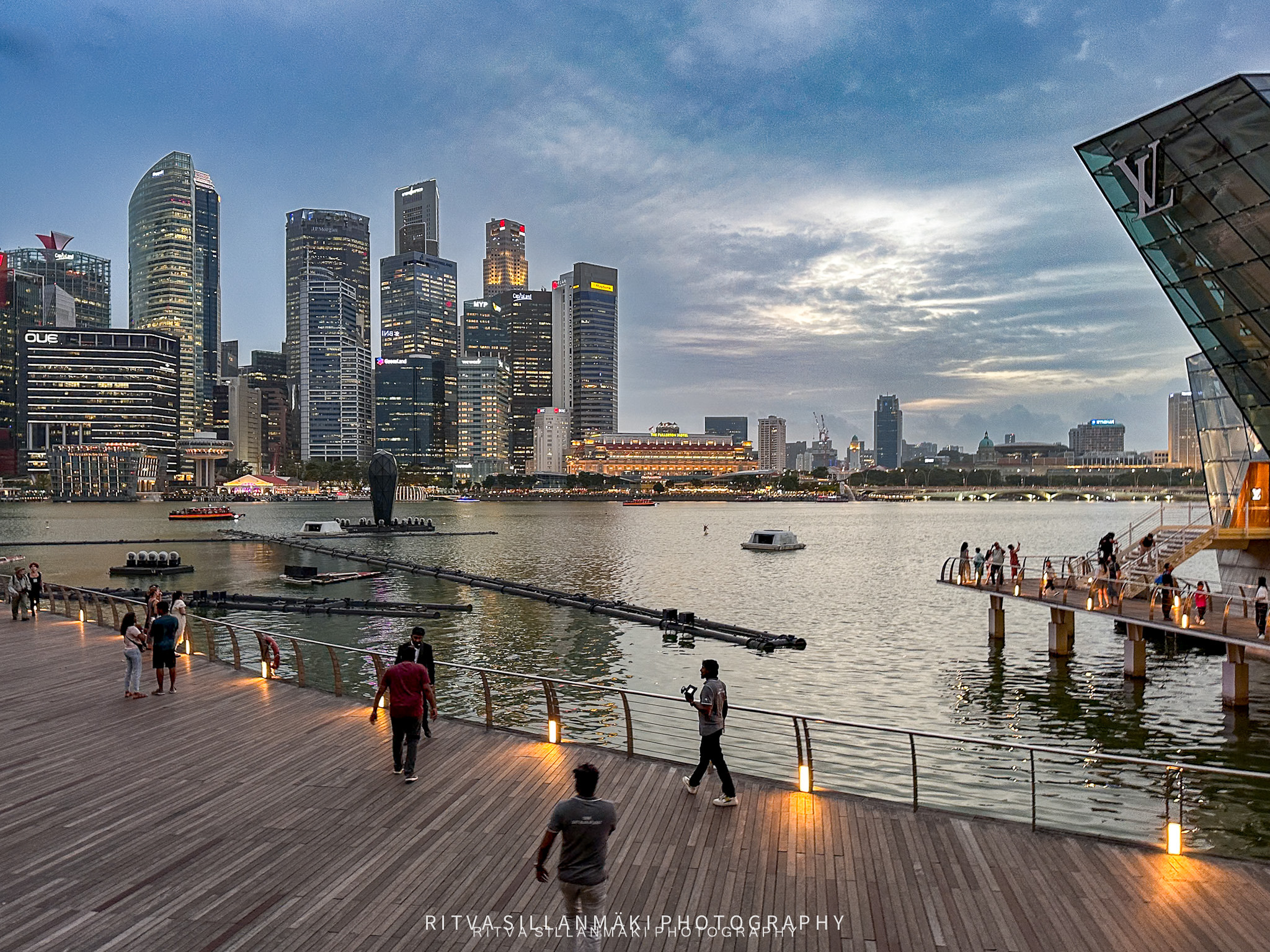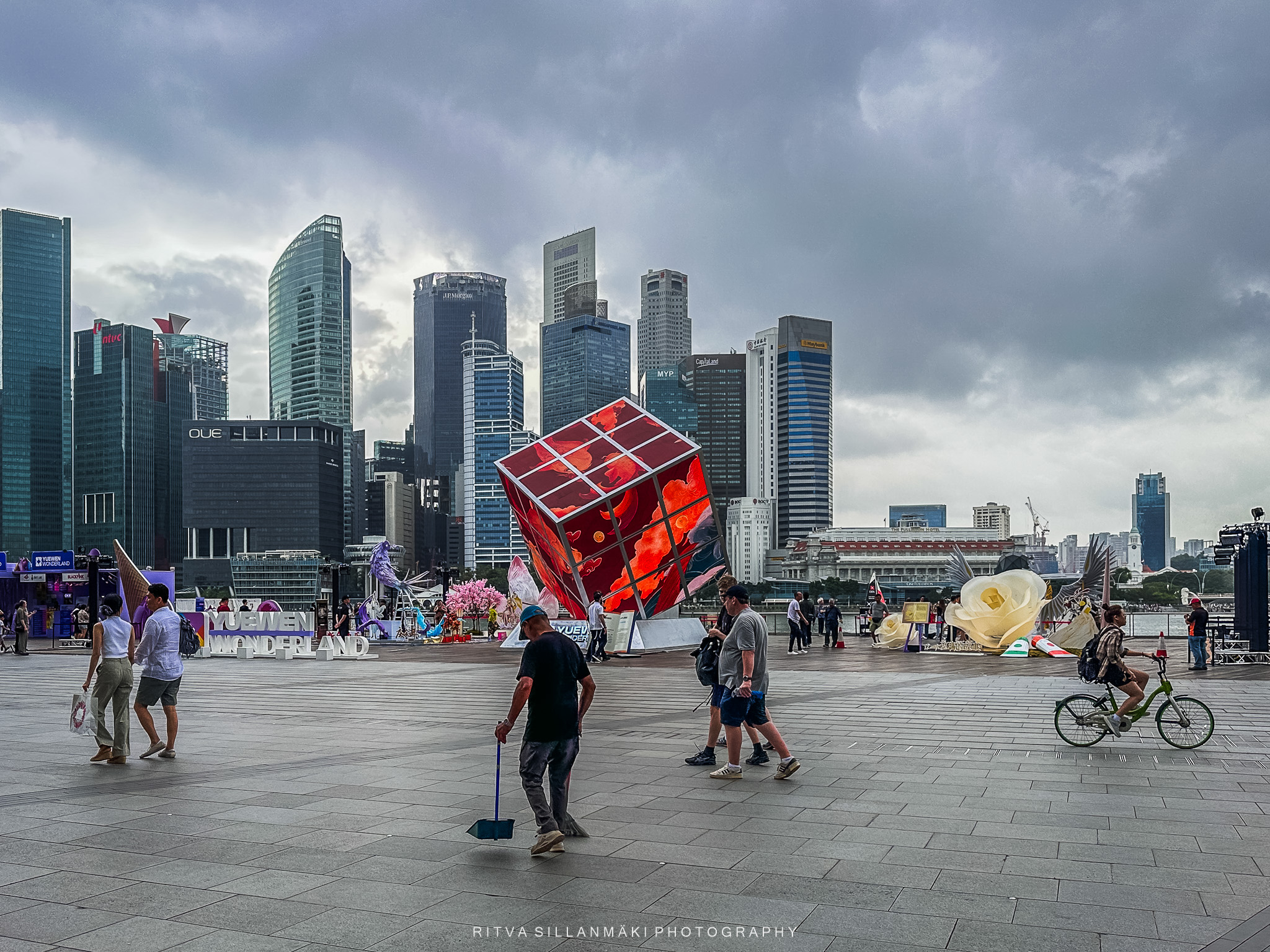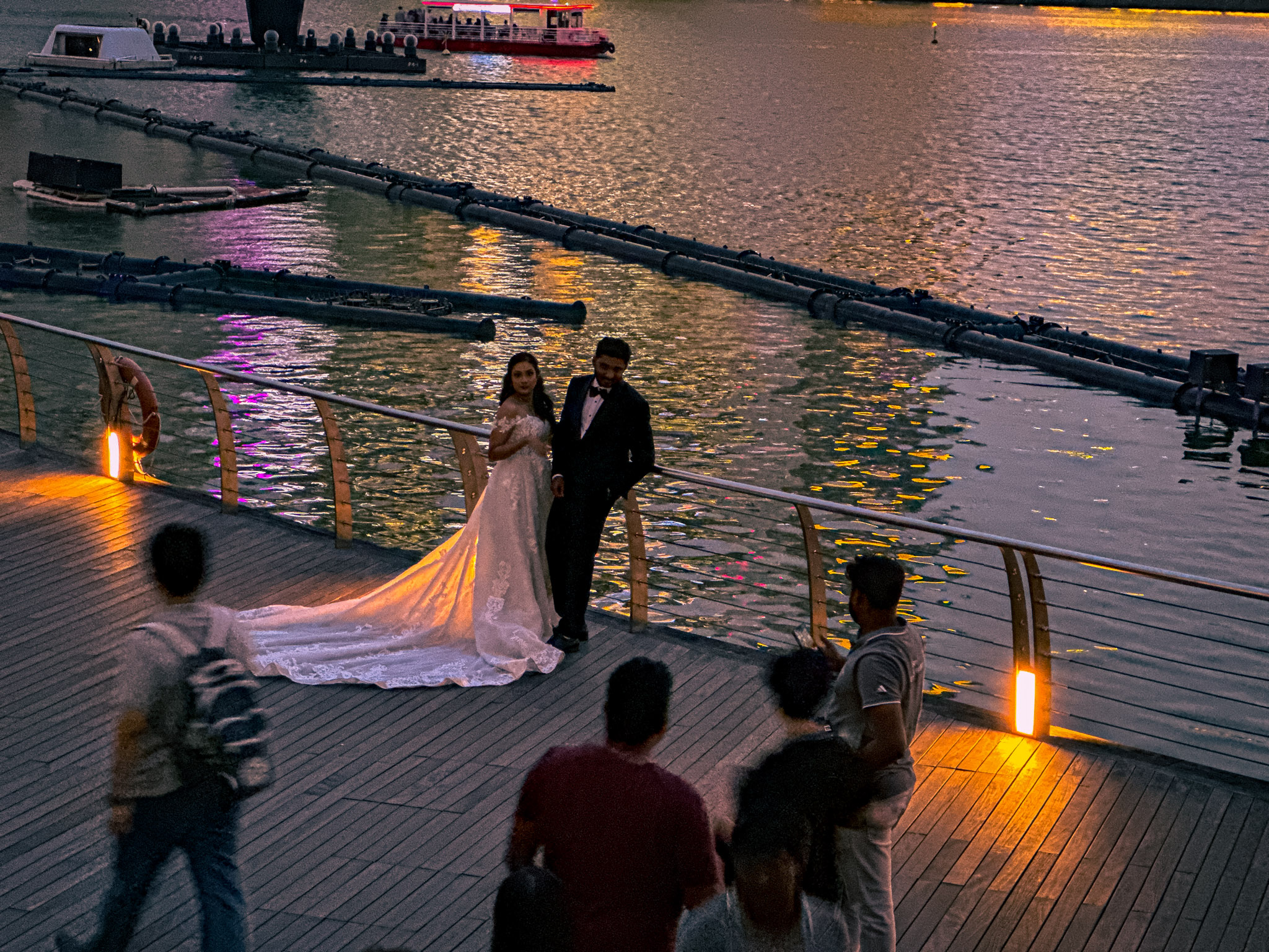 To capture the Water and Light Show in Marina Bay was also hard. The lit skyscrapers as a backdrop were obviously nice but documenting the show proved to be challenging. What was really fun however was that the show was so close to the event area that you got wet by the showers from the fountains. People in the know were prepared with raincoats and umbrellas but I wasn’t wise enough. Fortunately, it was a warm night. It goes without saying that the area was a really popular spot for photographers. We saw wedding and fashion pictures taken by the bay.