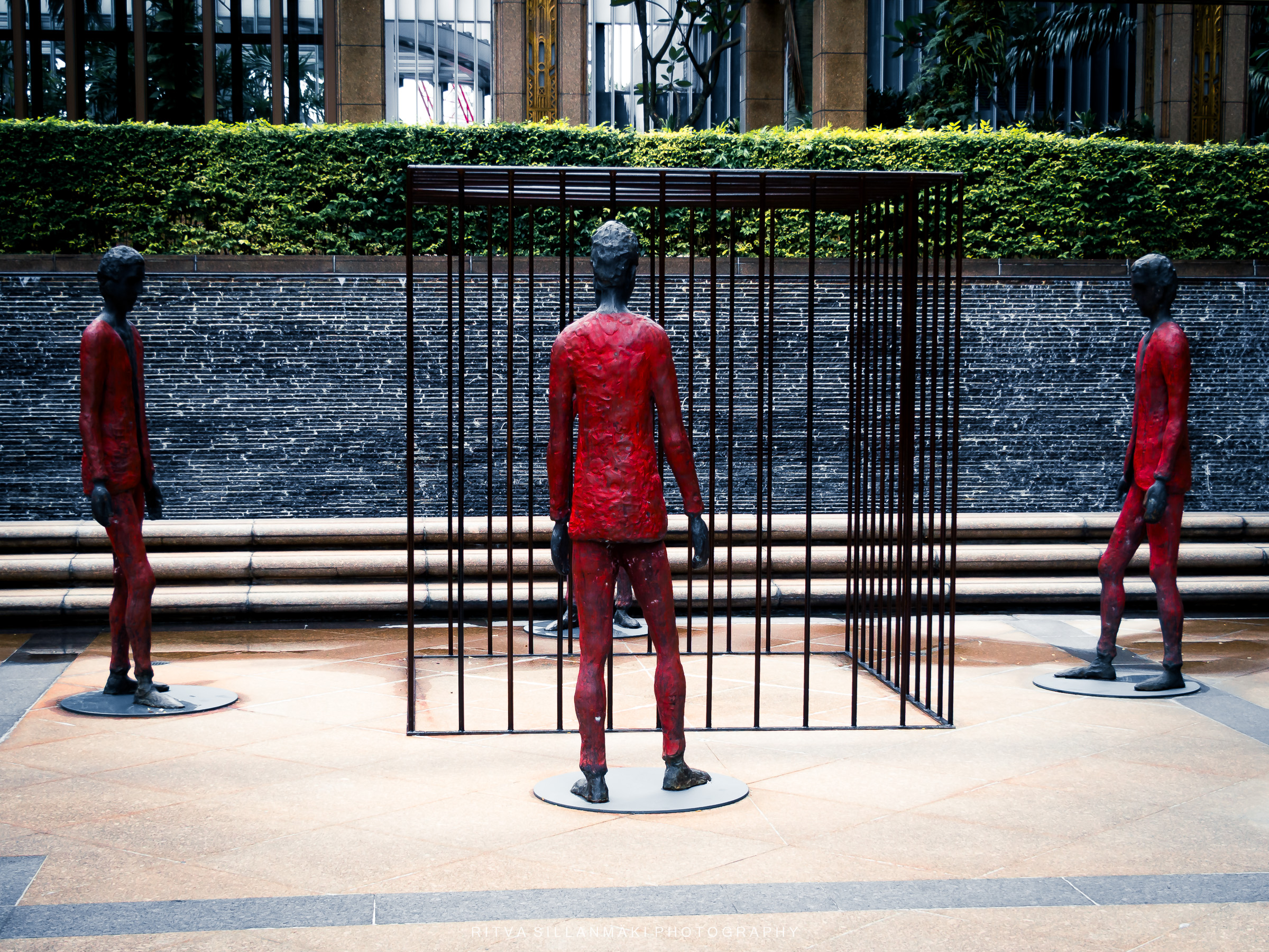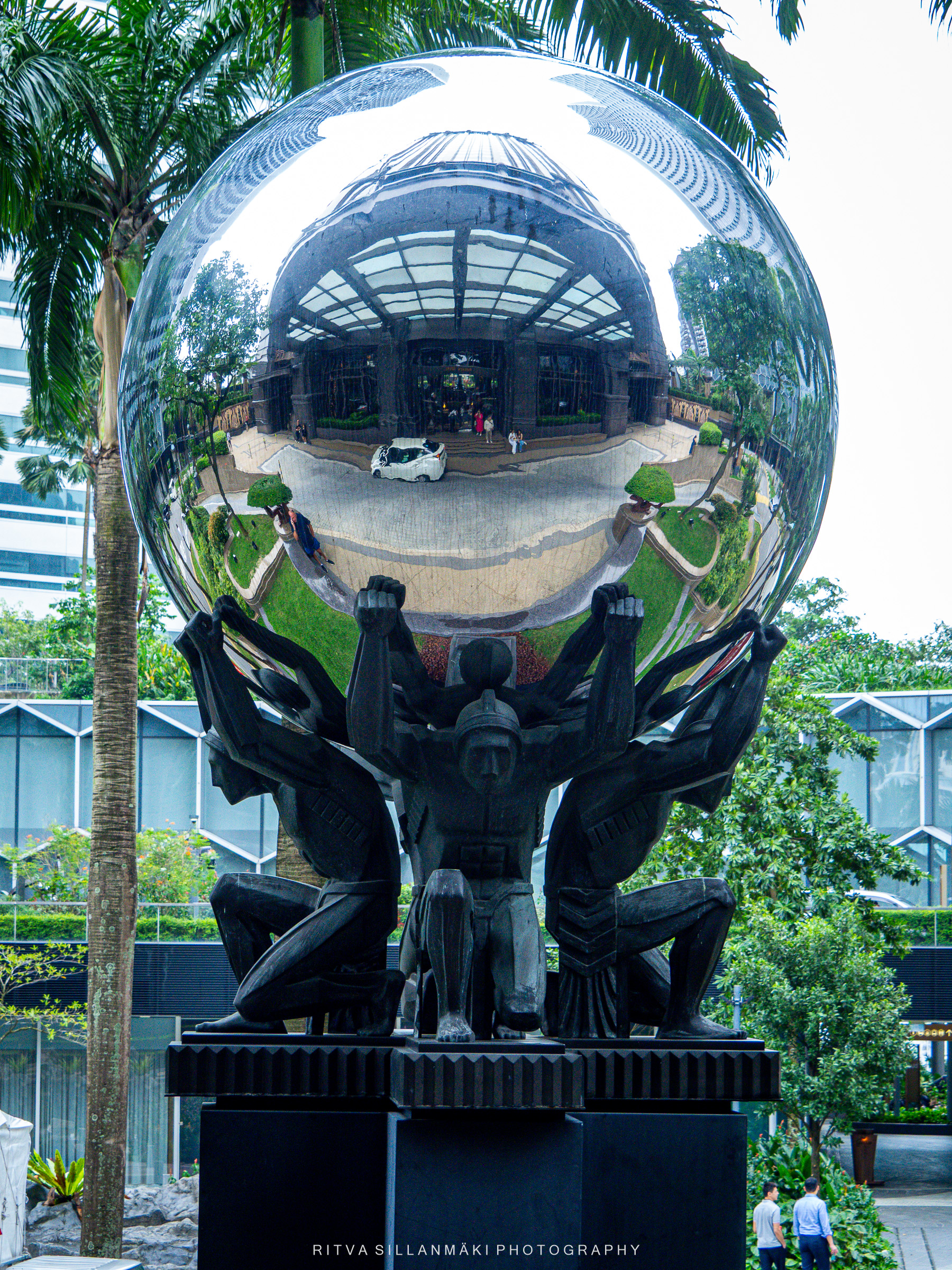 How to Survive the November features a photo from last winter’s trip to Singapore. Today’s round features four dark, stylized figures holding a large, reflective chrome orb. The orb distorts the reflection of the hotel entrance and the surrounding area. The statue is located at the entrance to the Atlas Hotel. I’m the red spot 😀