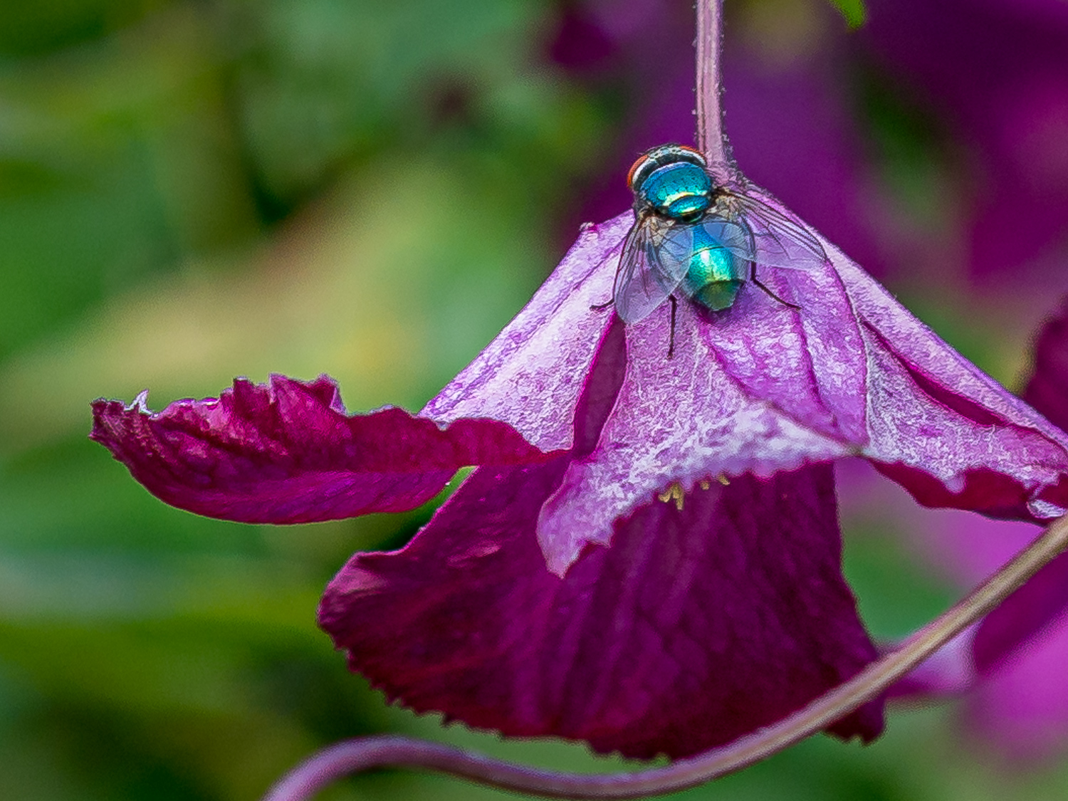 This fly, bug..I’ve no idea what it is as a species, but something I noticed was the bright green color, it was such a great contrast to the garland it was on. I must admit, I was happy I had my camera on hand.