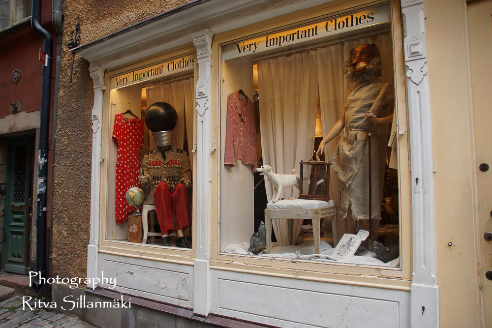 This week (#TB Thursday). Thursday is filled with memories from window shopping in Stockholm, Sweden. I for some reason find these quirky Very Important Clothes windows fun and creative. I have no idea if the shops exists an more, I doubt it. Many times these small business don’t have a very long life span. I generally like windows with creative design.