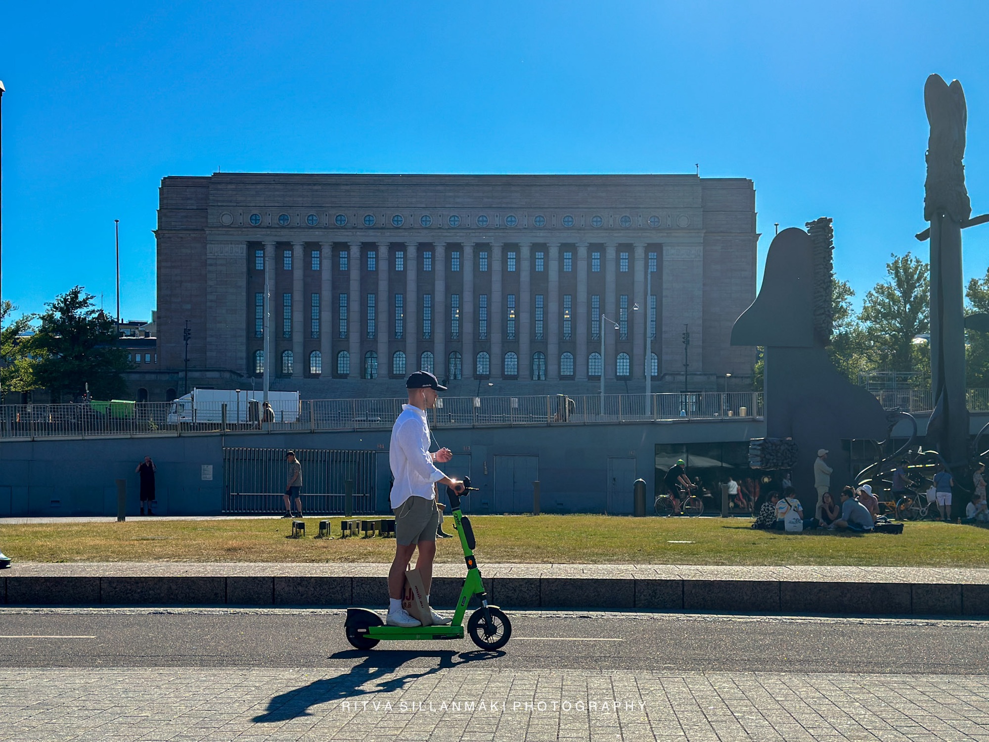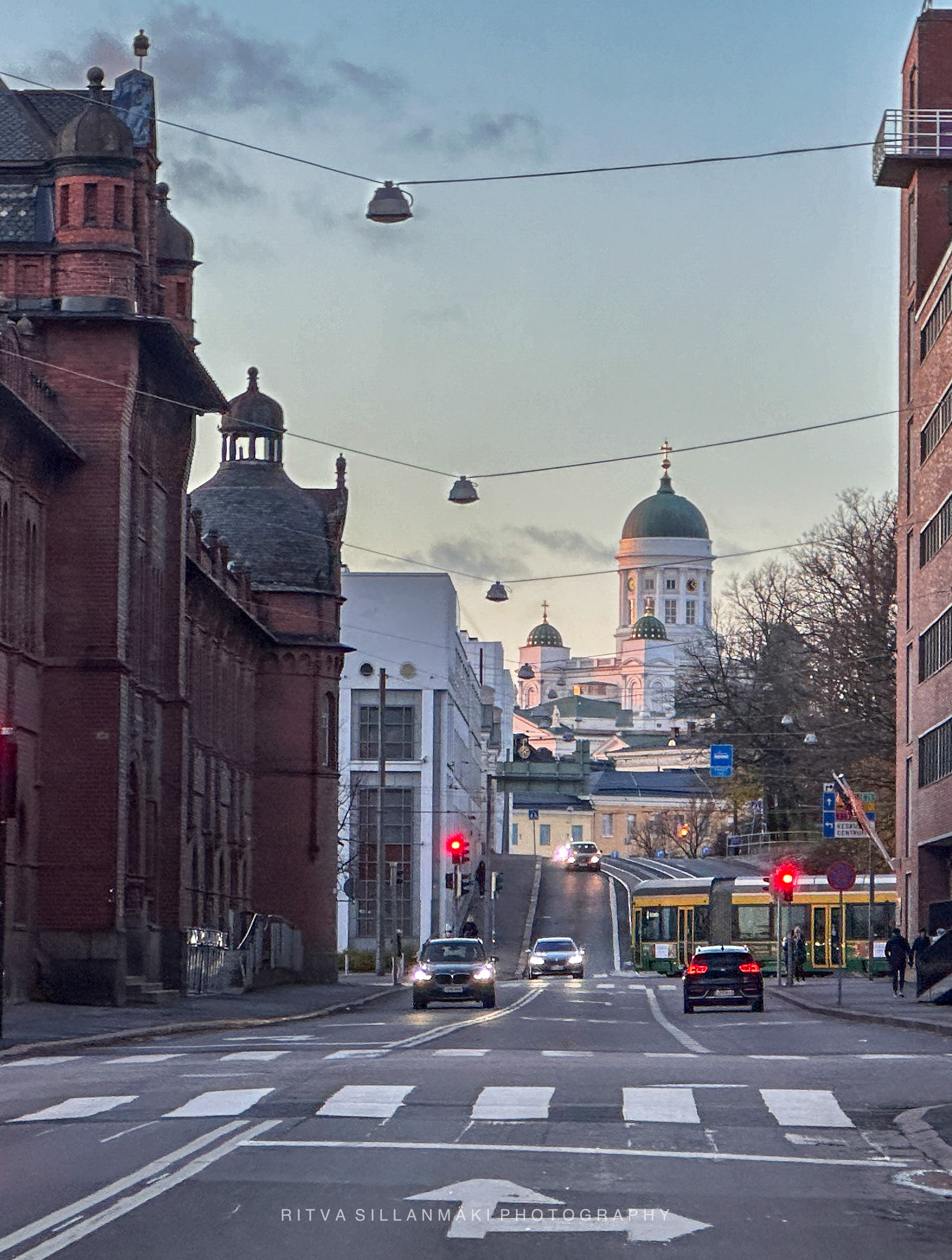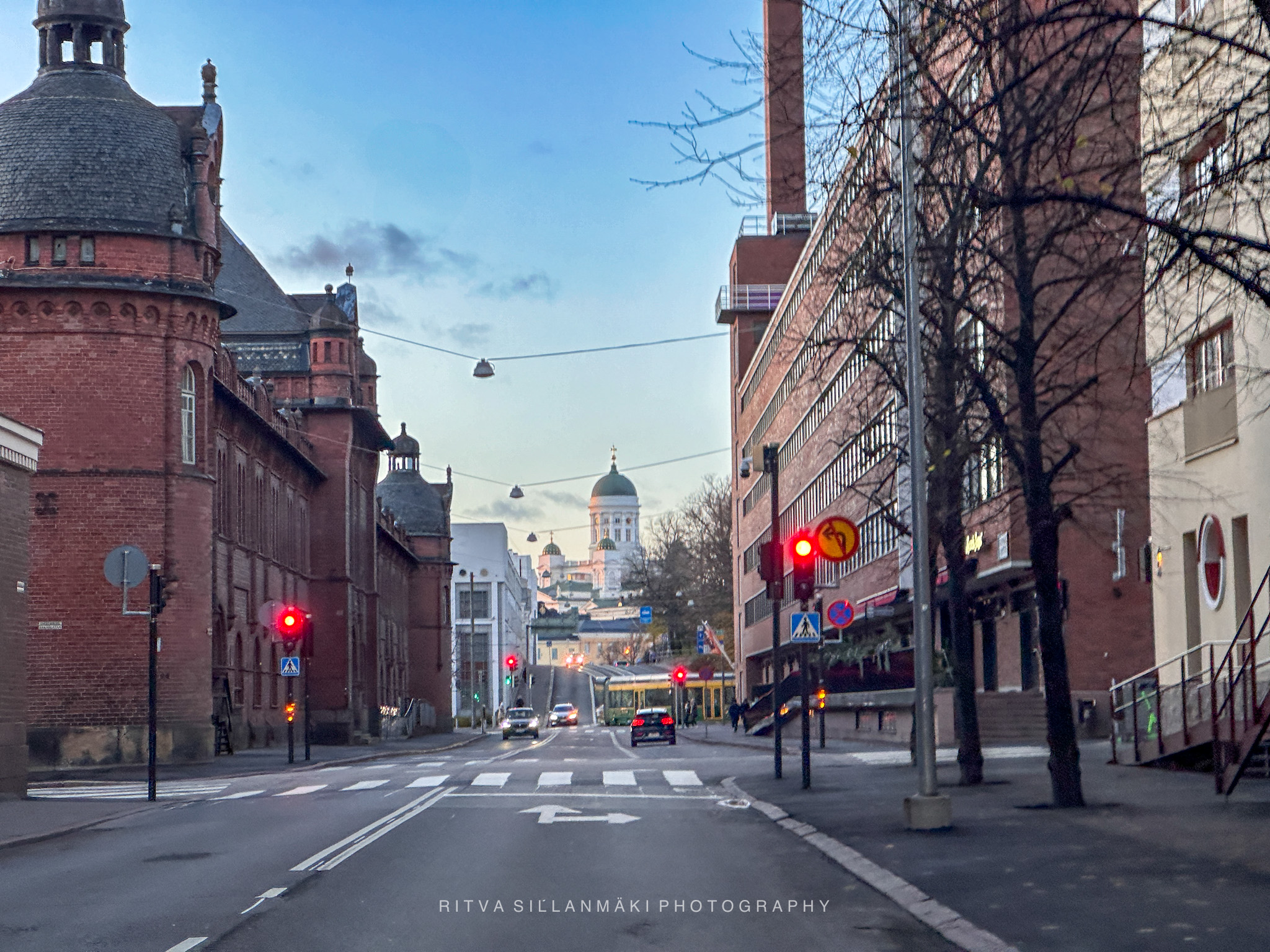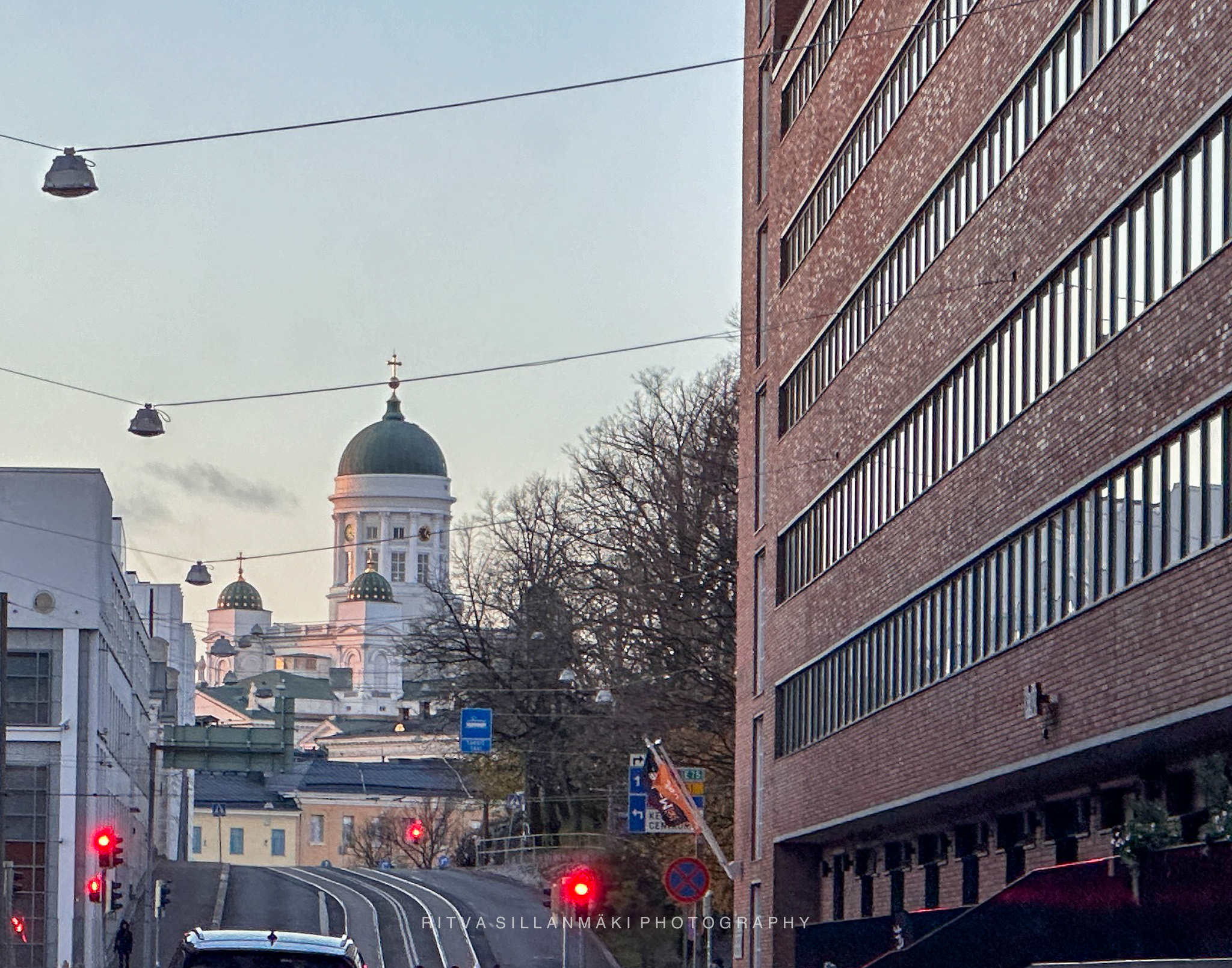 Here we are leaving the area, driving towards the Helsinki Cathedral