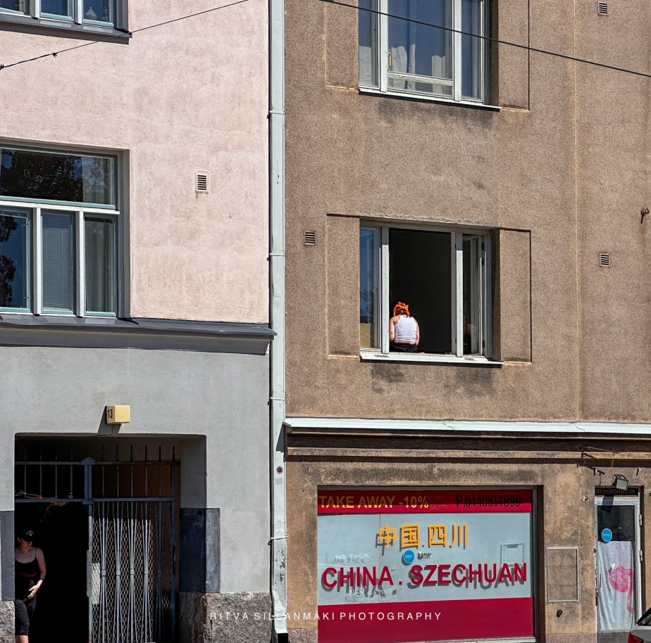 This is stretching it a bit, first I noticed the woman with the orange scarf, she was sitting on the edge of the window – facing me and the sun having a smoke. Before I could get the shot she turned. The restaurant is out of business, well by the looks f the door. There is a lady coming out through the gate in the corner. So there is a door in this shot 🙂