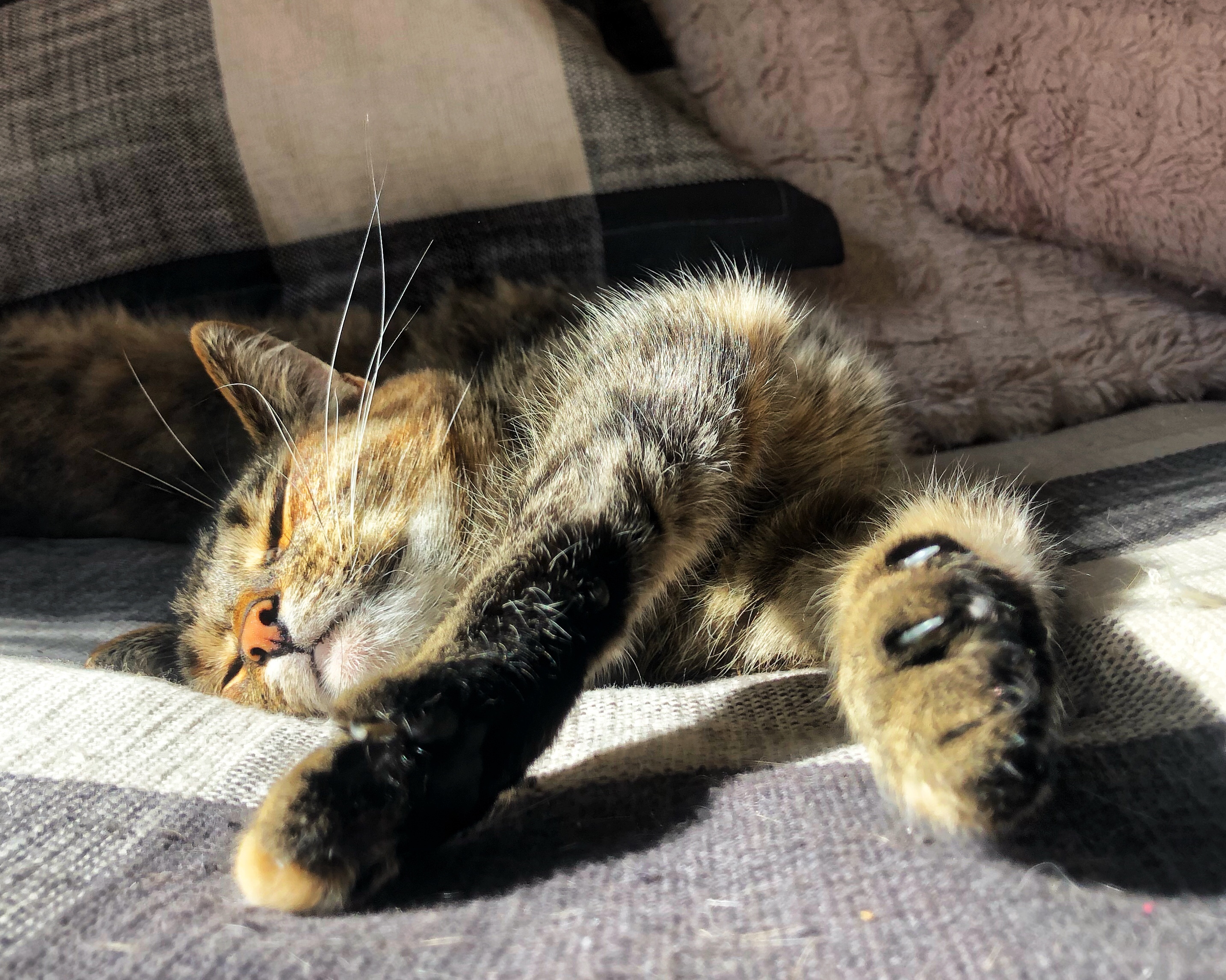 And I am always happy to share photos of Tinka. She is a funny little cat with her own ways, but still, you can tell that she likes us, and we really like her. She comes and spends time with us in the living room, sleeping on her own chair or on the ottoman, but to come on the sofa to be petted is something she will not do. Instead, she prefers to stretch out on the rug, then waits patiently to be petted as if she’s subtly hinting at her desire for affection. When l lay on the bed, note i have to be under the duvet, then she will place herself in the nook of your arm on your side and happily purrs whenever she gets all the attention. This does with me often at nights; it’s become a comforting routine. I oftentimes have trouble falling asleep for various reasons—thoughts racing through my mind or tor just discomfort or pain. During these moments, I often find myself waking up throughout the night. Yet, when Tinka comes to me, curling up in that perfect little spot and purring softly, she truly calms me down. I focus entirely on her soothing purrs, and I pet her in a calm way, feeling a sense of tranquility wash over me as I find solace in her presence.